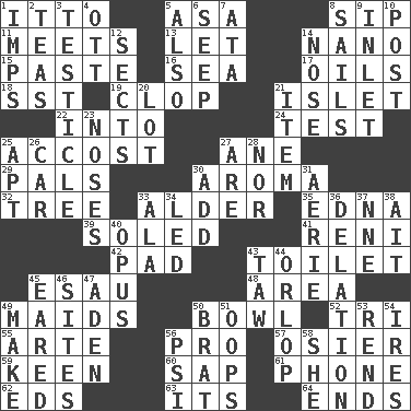 ACROSS 1. "Tell ____ the Marines!" 5. White ___ sheet 8. Small drink 11. Confronts 13. Allow 14. Billionth: prefix 15. Thick mixture 16. Ocean 17. Petroleums 18. Fast jet (abbr.) 19. Hoof sound 21. Small island 22. To the inside or interior of 24. Trial 25. Buttonhole 27. A saturated hydrocarbon 29. Friends 30. Scent 32. Woody plant 33. Tree or shrub in the Birch family 35. Pulitzer Prize-winning author Ferber 39. Having a sole or soles 41. Painter Guido (1575-1642) 42. Groovy apt. 43. Bathroom 45. He sold his birthright 48. Length times width 49. Women servants 50. Soup holder 52. Three (prefix) 55. Johnson of "Laugh-In" 56. Adept person 57. Flexible twig of a willow tree 59. Peachy ____! 60. Plant excrement 61. Give a jingle 62. Begley and Asner 63. ___ a Wonderful Life 64. Conclusions DOWN 1. Naughty children 2. Beverages made from leaves 3. A testis 4. Baseball player Mel 5. In addition 6. Ooze 7. "One Day ___ Time" 8. Travels by water 9. An arm off of a larger body of water 10. Mail 12. Religious groups 14. Sense of smell 20. Car dealer's back yard 21. Detail 23. Olfactory organs 25. Fitting 26. 4-wheeled motor vehicle 27. "We ___ not amused" (Victoria) 28. And not 30. Increase 31. Nest on high 33. Chicken ___ king 34. Directed 36. Conveyance 37. Compass dir. 38. Small island 40. Musical composition 43. The 23rd letter of the Hebrew alphabet 44. Lowest deck of a ship 45. Having ears or earlike features 46. Settings 47. Arabian gulf 49. Create 50. Naughty child 51. I made a mistake 53. Tear apart 54. Angers 56. Air pressure measure (abbr.) 58. A female animal or person
