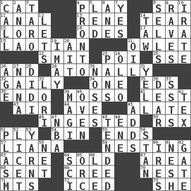 ACROSS 1. Domesticated feline 4. Live dramatic performance 8. _ Lanka 11. Of or related to the anus 13. French philosopher Descartes 14. Pull apart 15. Old wives' tales, e.g. 16. Lyric poems 17. Inventor's middle name 18. Of or relating to Laos or its people 21. A small or young owl 22. Stricken, poetically 23. Luau course 25. Compass dir. 26. Also 29. Without tonality 32. Lightheartedly 34. Single 35. Begley and Asner 38. Inside; within (prefix) 39. With motion or animation 41. For fear that 43. Wind 44. "___ Maria" 45. Having winglike extensions 46. Consumed 50. Acura sports coupe 51. Apply oneself diligently 54. Storage container 55. Conclusions 57. Climbing, woody, usually tropical vines 59. Snuggling 63. 1/640 square mile 64. Exchanged or delivered for money 67. Length times width 68. Posted 69. Algonquian 70. Egg locale 71. Mountains (abbr.) 72. On the rocks 73. A female animal or person DOWN 1. Give a ring to 2. Small Philippine buffalo 3. Edible starchy tuberous root 4. Right away 5. Directed 6. One (Scot) 7. It is so 8. Makes a sale 9. All-night dance parties 10. Feeling or showing extreme anger 12. Allows 14. The 23rd letter of the Hebrew alphabet 19. "If ____ say so..." 20. Small island 21. Petroleum 23. Baking dishes 24. Butter sub 26. Grow older 27. Grandmother 28. "You Light Up My Life" star Conn 30. Olfactory organs 31. Shout 33. Australian parrot (variant) 36. Letter starter 37. Fast planes 39. Wise men 40. Baking chamber 42. John Ritter's dad 45. Does sums 47. Basketball assoc. 48. Watched over 49. Compass dir. 51. Suffix with ecto or cyto 52. It is permitted: Lat. 53. Entertaining tales 56. Comedian Laurel of Laurel & Hardy 58. Fish or hair follower 60. Angers 61. Soft 62. Yard entry 64. _-fi 65. The grampus (Milton) 66. Area sheltered from the wind