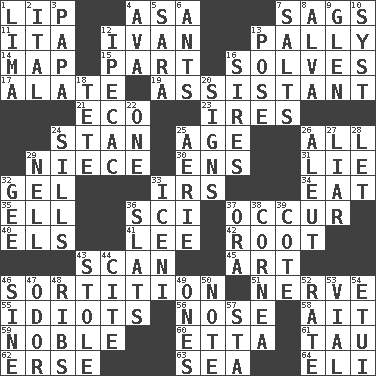 ACROSS 1. Mouth edge 4. White ___ sheet 7. Droops 11. Call ___ day 12. _ the terrible 13. Friendly 14. Atlas unit 15. Component 16. Finds the solution 17. Having winglike extensions 19. Aide 21. Environmental prefix 23. Angers 24. Comedian Laurel of Laurel & Hardy 25. Mature 26. 100% 29. Sibling's daughter 30. Followers of ems 31. Falsehood 32. Set 33. Big collection agency 34. Consume 35. Pipe bend 36. _-fi 37. Happen 40. Raised railways 41. Area sheltered from the wind 42. Carrot, for example 43. Examine minutely or intensely 45. Nonscientific branch of learning 46. Drawing lots 51. Effrontery 55. Foolish or stupid persons 56. Sense of smell 58. Small island 59. Having high moral qualities 60. Singer James 61. The 19th letter of the Greek alphabet 62. Celtic language 63. Ocean 64. Biblical high priest DOWN 1. Pale green bean 2. Slanted text style (abbr.) 3. Dad 4. Actress Gardner 5. "Two Mules for Sister ____" 6. Pismires 7. Table seasonings 8. Inventor's middle name 9. Small, secluded valley 10. System (abbr.) 12. Medicinal drug used to evoke vomiting 13. Airs 16. Fathers 18. Wig 20. Omens 22. Single 24. Beverly of Met fame 25. Nest on high 26. Eskimo relative 27. One who doesn't tell the truth 28. Allow 29. 1994 drama film starring Jodie Foster 32. Turn to the right 33. Ancient Celtic tribe of eastern Britain 36. Narrow boards 37. Mouth or opening 38. Pupil covering 39. ____ d'Azur (French Riviera) 43. Fur scarf 44. Quote 46. Trig term 47. Aroma 48. Chest bones 49. Singles 50. Musical sound 52. Assign a rank or rating to 53. Small bottle 54. Needle case 57. R.R. building
