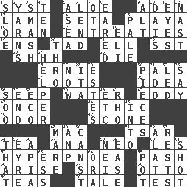 ACROSS 1. System (abbr.) 5. _ vera 9. Arabian gulf 13. Unable to walk 14. Bristle 15. Beach, in Buenos Aires 16. NW Algerian seaport 17. Pleas 19. Followers of ems 20. Small amount or degree 21. Pipe bend 22. Fast jet (abbr.) 23. Quiet! 25. Pass on 26. Bert's buddy 30. Friends 34. Plunders 35. It may be bright or harebrained 36. Ooze 39. Wetness 42. Whirlpool 43. At one time in the past 44. Moral principle 46. Aroma 47. Biscuitlike quick bread 48. Big _ 51. Russian ruler of old 54. Afternoon social gathering 57. Nursemaid (var.) 58. Modern: prefix 60. French article 62. Abnormally rapid or deep breathing 65. Romantic infatuation 66. Get up 67. Indian titles of respect 68. Von Bismarck 69. Beverages made from leaves 70. Lie 71. Trial DOWN 1. _ gin 2. Tall tales 3. Box-office sellout 4. "___ Little Indians" 5. Toward the sea 6. Grant temporary use of 7. Baseball player Mel 8. Having ears or earlike features 9. Keyboard modifier key 10. Raised platform 11. Sight organs 12. Political cartoonist Thomas 15. Diluted with white 18. Connecticut Ivy Leaguer 20. Through, poetically 24. Assistant 27. At this time 28. Call ___ day 29. _____ Park, CO 30. Parts 31. Find the sum of 32. Directed 33. Declare 36. "Barney Miller" actor Jack 37. Conclude 38. Environmental prefix 40. And so on (abbr.) 41. 17th letter of the Greek alphabet 45. To the inside or interior of 48. Female horse 49. Electrical Unit 50. 2nd pers. sing. pres. of can (arch.) 52. Having winglike extensions 53. Musical pauses 54. Not this but _ 55. Jane of fiction 56. Capital of Western Samoa 58. Famous astronaut Armstrong 59. Relaxation 61. Guess 63. Double-curved letter 64. Mouth or opening 65. Plant holder
