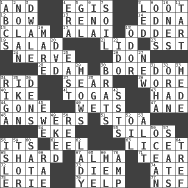 ACROSS 1. Added to 4. Armor plate that protects the chest 8. Plunder 12. Arrow shooter 13. Former U.S. Attorney General Janet 14. Pulitzer Prize-winning author Ferber 15. Dollar (slang) 17. Mountain range southwest of Kyrgyzstan 18. More peculiar 19. Vegetable dish 21. Flaplike covering 23. Fast jet (abbr.) 24. Effrontery 26. Spanish title 28. Dutch treat 30. Mood resulting from idleness 34. To free from 37. Dry up 39. Had on 40. Mamie's husband 41. Ancient Roman robes 43. Possessed 44. Went 46. Moistens 47. One (Scot) 48. Replies (to) 51. Portico 54. Make supply last 55. Grain storage towers 58. It is 61. Snakelike fish 63. It is permitted: Lat. 65. Broken piece 67. _ mater 71. Separate forcefully 72. Globular water bottle used in Asia 73. South Vietnam president (1954) 74. Had dinner 75. 4th largest of the Great Lakes 76. Sharp bark 77. Science/research agcy. DOWN 1. Lettered men learn these first 2. Pitcher Ryan 3. A sleeping potion; an opiate (poet.) 4. Epoch 5. Set 6. _ tizzy (2 wds.) 7. Earth 8. Directed 9. Probability 10. Washington bills 11. Small pie 16. Female horse 18. Aroma 20. Movie disc 22. Wedding promise 25. Compass direction 27. ___ Haven, CT 29. Catcalls? 30. Naughty children 31. Capital of the state of Qatar 32. Northwest Algerian city 33. Ancient Persian 34. Capital of Latvia 35. Picture 36. Habitations of wild animals 38. Personal question 42. Fast planes 45. She-sheep 49. Supplemented with great effort 50. To sift 52. Lubricate 53. Came down and settled, as after flight 56. Sea 57. Theater features 58. Capri or Wight 59. Son of Odin 60. Suttee (variant) 62. Kenny Rogers chart-topper in '80 64. Unclean, religiously 66. Actress Charlotte 68. Whopper 69. Cartoonist voice _ Blanc 70. Electrical Unit