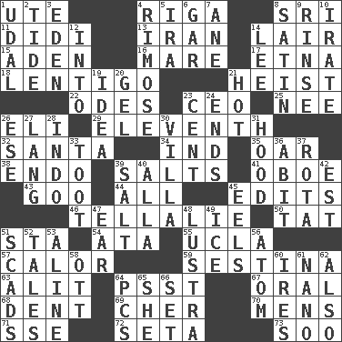 ACROSS 1. Shoshoni 4. Port city in Latvia 8. _ Lanka 11. "You Light Up My Life" star Conn 13. SW Asia republic 14. Den 15. An important port of Yemen 16. Female horse 17. Inactive volcano in Sicily 18. Small, flat, pigmented spot on the skin 21. Robbery 22. Lyric poems 23. Corporate head (abbr.) 25. Born 26. Biblical high priest 29. Veterans Day date 32. Before Barbara or Clara 34. Working for oneself (abbr.) 35. Rowing implement 38. Inside; within (prefix) 39. Table seasonings 41. Mitch Miller's instrument 43. Thick or sticky substance 44. 100% 45. Prepares for publication 46. Copy Pinocchio 50. Make lace 51. R.R. building 54. "One Day ___ Time" 55. Southern CA. univ. 57. Bodily heat indicating an inflammation 59. French poetic form 63. Set down 64. Inconspicuous attention getter 67. Of the mouth 68. Undesirable depression on a surface 69. "Mermaids" star 70. Not women's 71. Compass dir. 72. Stalk of a moss capsule 73. "Barney Miller" actor Jack DOWN 1. Allodial 2. Event that recurs at intervals 3. Genesis locale 4. Full of chinks, cracks, or crevices 5. Lyricist Gershwin 6. Slender fish 7. A saturated hydrocarbon 8. Smooth fabric 9. Wash lightly 10. Feeling or showing extreme anger 12. To the inside or interior of 14. Area sheltered from the wind 19. The main thing one is thinking about 20. Set 21. Being at a high temperature 23. Penny 24. Extremities 26. Compass dir. 27. Austrian-born American filmmaker Fritz 28. _ china 30. Country estate 31. Parka part 33. A blast of a horn 36. "This won't hurt ____!" 37. Roll call or roster of names 39. Table seasoning 40. Silent film actress Nazimova 42. Eastern Standard Time (abbr.) 45. Snakelike fish 47. Hearing organ 48. A period of five years 49. Frozen water 51. Loads 52. Stories 53. Place in a line 56. Smallest unit of an element 58. Baseball player Mel 60. Angers 61. Billionth: prefix 62. In addition 64. Personal Computers (abbr.) 65. A female animal or person 66. Arrange properly for use