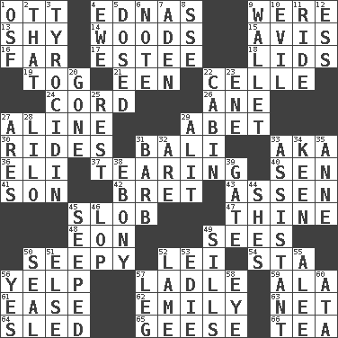 ACROSS 1. Baseball player Mel 4. Ferber et al. 9. Past tense of be (plural) 13. Like a shrinking violet 14. Forest 15. Deliberation 16. At a great distance 17. First name in cosmetics 18. Flaplike coverings 19. Coat; cloak 21. Car or cant ending 22. Cell (Danish) 24. Drawstring 26. A saturated hydrocarbon 27. Place in a line 29. Collude with 30. Amusement-park features 31. Indonesian resort city 33. Alias (abbr.) 36. Connecticut Ivy Leaguer 37. Rending 40. Elected rep. 41. Manchild 42. Cy Young winner Saberhagen 43. NE Netherlands city 45. Messy guy 47. One or ones belonging to thee 48. Period of immesurable duration 49. Observes 50. Not well drained, as in land 52. Luau accessory 54. R.R. building 56. Sharp bark 57. Dipping utensil 59. Wing 61. Relaxation 62. Poet Dickinson 63. Fish or hair follower 64. Downhill vehicle 65. Honkers 66. Afternoon social gathering DOWN 1. Order of Saint Francis (abbr.) 2. Not this but _ 3. Polypeptide antibiotic 4. She-sheep 5. Administered medicine 6. Make mention of 7. An important port of Yemen 8. Compass dir. 9. Place for singles 10. Tending to cause great harm 11. Travel on an animal 12. Curvy letter 20. Went 22. Apartment or room in a ship 23. Compass dir. 25. Relief 27. Ancient Greek god of war 28. _ and Stitch 29. Set down 31. Sharp remark 32. "We ___ not amused" (Victoria) 33. Aide 34. Peachy ____! 35. Queen of England 1702-14 38. Dark wood 39. Yard entry 44. "______ My Girl" (Turtles hit) 45. Oozed 46. Chop off 49. Beverly of Met fame 50. Lick closed 51. Otherwise 52. Unable to walk 53. Singer Brickell 55. Toward shelter 56. Affirmative reply 57. Part of a journey 58. Sight organ 60. _ moment's notice (2 wds.)