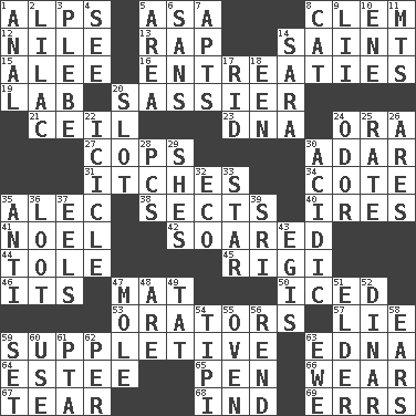ACROSS 1. High mountains 5. White ___ sheet 8. Clement's nick name 12. "Death on the ____" 13. Strike 14. Inhabitant of Heaven 15. Toward shelter 16. Pleas 19. Experiment locale 20. More impudent 21. To provide with a ceiling 23. Heredity factor (abbr.) 24. Mouth or opening 27. 911 reaches them 30. The sixth month of the Jewish calendar 31. Irritating cutaneous sensations 34. ____ d'Azur (French Riviera) 35. Actor Baldwin 38. Religious groups 40. Angers 41. Christmas carol 42. Flew 44. Lacquered or enameled metalware 45. Swiss mountan, "Queen of the Mountains" 46. ___ a Wonderful Life 47. Floor covering 50. On the rocks 53. Speakers 57. Untruth 59. Supplying deficiencies 63. Pulitzer Prize-winning author Ferber 64. First name in cosmetics 65. Animal enclosure 66. Put on (as clothing) 67. Pull into pieces 68. Working for oneself (abbr.) 69. Blunders DOWN 1. Of or related to the anus 2. Pale purple color 3. Military trainee 4. Observe 5. Length times width 6. Without 7. Flats, for short 8. Feline 9. Cards in a Roman deck? 10. Compass dir. 11. Mountains (abbr.) 14. "Two Mules for Sister ____" 17. To free from 18. Car or cant ending 20. Notch 22. Hanging ice 24. Scent 25. Assign a rank or rating to 26. Ancient Greek god of war 28. Personal Computers (abbr.) 29. "______ My Girl" (Turtles hit) 30. Being or containing an acid 32. Environmental prefix 33. Play the lead 35. Against 36. Spoils 37. Snakelike fish 39. Indian title of respect (Mr.) 43. The front part of a cuirass 47. Undercover agent 48. "We ___ not amused" (Victoria) 49. Make lace 51. A person who is older than you are 52. Middle Eastern gold or silver currency 54. Native american tent (variation) 55. Baking chamber 56. Tear apart 58. Hearing organs 59. Put into a specified state 60. Purpose 61. Parent Teacher Assoc. 62. For each 63. She-sheep