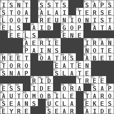 ACROSS 1. Is not 5. Fast planes 9. Plant excrements 13. Portico 14. Mountain range southwest of Kyrgyzstan 15. Laconic 16. Plunder 17. One who advocates reunion 19. Raised railways 20. Help 21. Republican Party 22. "One Day ___ Time" 23. Snakelike fish 25. Compass dir. 26. Nest on high 30. SW Asia republic 34. Aches 35. Make mention of 36. Confront 39. Expletives 42. Collude with 43. "Corrida" creature 44. Eroded 46. Fastener 47. Chalkboard 48. To free from 51. Woody plant 54. Double-curved letter 57. Binary compound 58. Mouth or opening 60. Plant excrement 62. Form of transportation 65. Edible starchy tuberous root 66. Seines 67. Southern CA. univ. 68. Makes supply last 69. Jane of fiction 70. Singe 71. Helper DOWN 1. Small island 2. Took without asking 3. Trap for birds or small mammals 4. Make lace 5. Indian skirt 6. Downhill vehicle 7. The 19th letter of the Greek alphabet 8. Scorch 9. Elected rep. 10. Roberta Peters solo 11. Inconspicuous attention getter 12. Bristle 15. Drink excessively 18. Electrically charged atom 20. Toward the sea 24. Portable computer 27. _ de Janeiro 28. _ tizzy (2 wds.) 29. _____ Park, CO 30. More lacking in sense or substance 31. Director Reiner 32. Had dinner 33. Remaining after all deductions 36. Mountains (abbr.) 37. Period of immesurable duration 38. Period 40. Actor Linden 41. R.R. building 45. Singer James 48. Basketball hoops 49. Wedding promise 50. To get out of a bus 52. 1973 Nobel Price Winner (Physics) Leo 53. Having ears or earlike features 54. Comfort 55. Chop _ 56. Play the lead 58. Rounded earthenware pot or jar 59. Bring up, as a child 61. Airs 63. Single 64. Frozen water 65. Afternoon social gathering