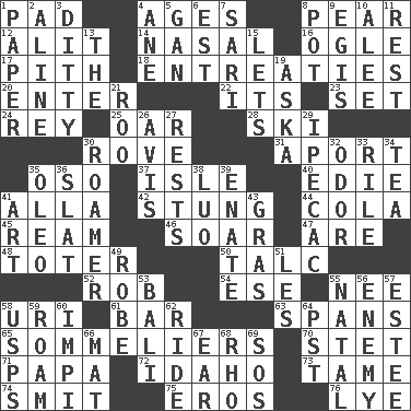 ACROSS 1. Writing tablet 4. Grows older 8. Lightbulb-shaped fruit 12. Came down and settled, as after flight 14. Rhinal 16. Stare at amorously 17. Essential or central part 18. Pleas 20. Keyboard key 22. ___ a Wonderful Life 23. Arrange properly for use 24. Marina Del _, California 25. Rowing implement 28. What Jean-Claude Killy likes to do 30. Be footloose 31. To the left, to Queeg 35. Bear (Spanish) 37. Capri or Wight 40. Singer Brickell 41. Silent film actress Nazimova 42. Feeling sharp psychological pain 44. Root beer relative 45. 480, 500 or 516 sheets of paper 46. Fly high 47. "We ___ not amused" (Victoria) 48. Carrier 50. Baby powder 52. Director Reiner 54. Compass dir. 55. Born 58. RI univ. 61. Tavern 63. Connects, as a bridge 65. Wine waiters 70. Proofreading order 71. Dad 72. Potato state 73. Docile 74. Stricken, poetically 75. Greek god of love 76. Potassium hydroxide DOWN 1. Some stationery 2. Place in a line 3. Short, simple song 4. A saturated hydrocarbon 5. Separate the seeds from cotton 6. Eastern Standard Time (abbr.) 7. Indian skirt 8. Cooking vessel 9. The front part of a cuirass 10. Toward shelter 11. Take ten 13. Definite Article 15. Allows 19. "____ silly question..." 21. Friend of Pooh 26. Advice 27. Musical pauses 29. Medicinal drug used to evoke vomiting 30. Wanderer 32. Scent 33. Cause heat under the collar 34. Beverage made from leaves 35. Butter sub 36. Narrow board 38. Nilotic language 39. Related on the mother's side 41. Tate display 43. Pate de foie ____ 49. Loose flowing garment 51. French article 53. Indonesian resort city 55. Brizilian seaport 56. Foe 57. First name in cosmetics 58. United States Postal Service (abbr.) 59. Wander 60. Body of Kaffir warriors 62. Travel on an animal 64. Pacific Standard Time (abbr.) 66. Floor protector 67. Hearing organ 68. 17th letter of the Greek alphabet 69. Mayday