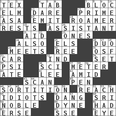 ACROSS 1. John Ritter's dad 4. Bar bill 7. Coalition 11. Shade tree 12. Have the gumption 13. First class 14. White ___ sheet 15. Send forth 16. Nomad 17. Musical pauses 19. Helper 21. Assist 23. Singles 24. In addition 25. Raised railways 26. Superhero pair 29. Confronts 30. To riddle 31. Order of Saint Francis (abbr.) 32. Automobile 33. Indiana (abbr.) 34. Arrange properly for use 35. 23rd letter of the Greek alphabet 36. _-fi 37. Distance measurement 40. Had dinner 41. Area sheltered from the wind 42. Among 43. Examine hastily 45. Fenced enclosure 46. Casting lots 51. Arrive at 55. Foolish or stupid persons 56. Mild oath, euphamism for damn 58. Indian title of respect (Mr.) 59. Having high moral qualities 60. Unit of force 61. Possessed 62. Celtic language 63. Compass dir. 64. Sight organ DOWN 1. Lacerate 2. Otherwise 3. Dec. holiday 4. Scottish cap 5. Operatic vocal solo 6. Stakes 7. Naughty children 8. Pale green bean 9. Presage 10. Certainty 12. Stop 13. Introduce or present, as a question 16. Wash lightly 18. Story 20. Having a sole or soles 22. Two (Sp.) 24. Nest on high 25. Bert's buddy 26. Administered medicine 27. One who uses or employs something 28. Often (poetically) 29. Vertical spar for supporting sails 32. Tax preparer (abbr.) 33. Ancient Celtic tribe of eastern Britain 36. Narrow boards 37. Atlas unit 38. Develop 39. Prong on a fork 43. Fur scarf 44. Quote 46. Trig term 47. Aroma 48. Teases 49. Likelihood 50. Negative votes 52. American tennis player Robert 53. Supercomputer manufacturer 54. Flintstone garb 57. Compass dir.