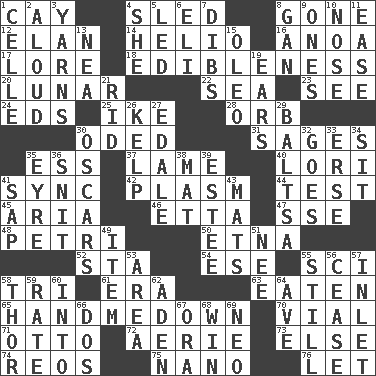 ACROSS 1. Island 4. Downhill vehicle 8. Went 12. Liveliness 14. Sun: prefix 16. Small Philippine buffalo 17. Old wives' tales, e.g. 18. The property of being fit to eat 20. Type of eclipse 22. Ocean 23. Observe 24. Begley and Asner 25. D.D.E's nickname 28. Globe 30. Wrote a lyric poem 31. Gurus 35. Curvy letter 37. Unable to walk 40. Australian parrot (variant) 41. Synchronize (abbr.) 42. Suffix with ecto or cyto 44. Trial 45. Roberta Peters solo 46. Singer James 47. Compass dir. 48. _ dish (used to culture cells) 50. Inactive volcano in Sicily 52. R.R. building 54. Compass dir. 55. _-fi 58. Three (prefix) 61. Epoch 63. Consumed 65. Sleeping bag shop? 70. Small bottle 71. "Beetle Bailey" pooch 72. Nest on high 73. Otherwise 74. Vintage cars 75. Billionth: prefix 76. Allow DOWN 1. Cell (Danish) 2. Verbally 3. Entertaining tales 4. A female animal or person 5. Directed 6. Biblical high priest 7. Rights 8. Separate the seeds from cotton 9. Washington bills 10. Olfactory organ 11. Comfort 13. Teachers' org. 15. Butter sub 19. Hearing organs 21. To free from 26. Seaweed 27. Peak District village in England 29. Greek mezzo-soprano Agnes 30. Motion picture awards 32. Leaves 33. Celtic language 34. Be seated 35. Jane of fiction 36. In a ____ (agitated or irritated) 38. Floor covering 39. First name in cosmetics 41. Plant excrement 43. Floor protectors 49. A distinct part 51. Born 53. Type of rug 55. Free from disturbance or agitation 56. Stop 57. An arm off of a larger body of water 58. Son of Odin 59. Assign a rank or rating to 60. To the inside or interior of 62. An important port of Yemen 64. "___ Maria" 66. Two (Sp.) 67. Mouth or opening 68. Victory 69. Modern: prefix