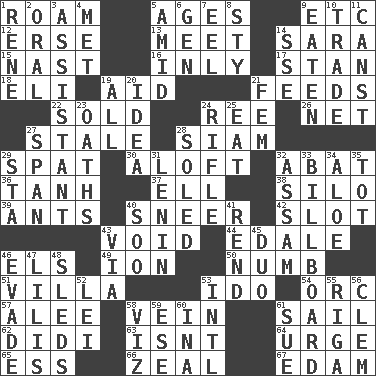 ACROSS 1. Wander 5. Eras 9. And so on (abbr.) 12. Celtic language 13. Rendezvous 14. "Two Mules for Sister ____" 15. Political cartoonist Thomas 16. Inwardly 17. Comedian Laurel of Laurel & Hardy 18. Connecticut Ivy Leaguer 19. Help 21. Gives food to 22. Exchanged or delivered for money 24. Portuguese money of account (variant) 26. Fish or hair follower 27. Showing deterioration from age 28. Thailand, formerly 29. Petty quarrel 30. At or to great height 32. Blind as ____ 36. Hyperbolic tangent 37. Pipe bend 38. Grain storage tower 39. Pismires 40. Scornful expression 42. Position in a hierarchy or organization 43. State of nonexistence 44. Peak District village in England 46. Raised railways 49. Electrically charged atom 50. Unfeeling 51. Country estate 53. Wedding promise 54. The grampus (Milton) 57. Toward shelter 58. Distinctive style or manner 61. Travel by water 62. "You Light Up My Life" star Conn 63. Is not 64. Goad 65. Curvy letter 66. Ardor 67. Dutch treat DOWN 1. French philosopher Descartes 2. Of the mouth 3. Helper 4. Was introduced to 5. Among 6. Commissioned mil. rank 7. Snakelike fish 8. Filthy place 9. Consumed 10. Buy and sell 11. 2nd pers. sing. pres. of can (arch.) 14. Compass dir. 19. Everything 20. It may be bright or harebrained 21. Opposite of masc. 23. Curses 24. Firearm 25. Consume 27. Connect, as a bridge 28. Having a sole or soles 29. R.R. building 31. Soviet premier 1918-24 32. Indian state 33. Big road sign 34. Medicinal plant 35. Small child 40. "Barney Miller" actor Jack 41. Tear apart 43. By way of 45. Superhero pair 46. Elude 47. Ms. Damita and namesakes 48. Bobsleighs 52. Flowery wreath 53. International (abbr.) 55. Port city in Latvia 56. Clement's nick name 58. Namely 59. Compass dir. 60. _ tizzy (2 wds.) 61. Institute legal proceedings