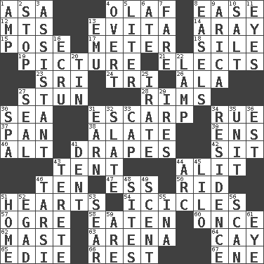 ACROSS 1. White ___ sheet 4. Norwegian king 8. Relaxation 12. Mountains (abbr.) 13. Webber/Rice musical 14. Like ___ of sunshine 15. Introduce or present, as a question 17. Distance measurement 18. Drop; flow; fall 19. Photo 21. Opts 23. Indian title of respect (Mr.) 24. Three (prefix) 26. According to 27. Make senseless or dizzy 28. Basketball hoops 30. Ocean 31. Fortification 34. Sorrow 37. Baking dish 38. Having winglike extensions 39. Followers of ems 40. The first octave above the treble staff 41. Window treatments 42. Be seated 43. Portable shelter 44. Set down 46. "___ Little Indians" 47. Double-curved letter 50. To free from 51. Centers of feelings and intuitions 54. Winter's stalactites 57. Legendary monster 58. Ingested 60. Single time 62. Vertical spar for supporting sails 63. Sports stadium 64. Island 65. Singer Brickell 66. Repose 67. Compass dir. DOWN 1. Electrical Unit 2. Discontinue 3. Aide 4. Unconcealed 5. 61 cubic inches 6. Had dinner 7. Conductor's collection 8. Artist's stands 9. N. Chile seaport 10. Table seasoning 11. Sight organs 13. Australian flightless bird 16. Shade of tan 20. Shallow baking pan 22. Desk light 25. Feeling or showing extreme anger 27. Lick closed 29. Angers 30. Health resort 31. Merit 32. Chalkboard 33. Head covering 34. Home 35. A single undivided whole 36. Eastern Standard Time (abbr.) 41. Gouge 43. Cigar-shaped 44. Curve 45. _ and Stitch 46. Tarsus (plural) 48. Settings 49. Aroma 51. Dwelling 52. Mild oath 53. Dry up 55. _ tizzy (2 wds.) 56. Examine hastily 59. "We ___ not amused" (Victoria) 61. Sight organ