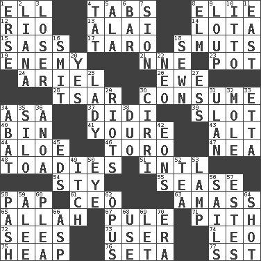 ACROSS 1. Pipe bend 4. Bar bills 8. Writer Wiesel 12. _ de Janeiro 13. Mountain range southwest of Kyrgyzstan 14. Globular water bottle used in Asia 15. Backtalk 17. Pacific island yam 18. Obscenities 19. Foe 21. Compass dir. 23. Plant holder 24. Satellite of Uranus 26. She-sheep 28. Russian ruler of old 30. Ingest 34. White ___ sheet 37. "You Light Up My Life" star Conn 39. Position in a hierarchy or organization 40. Storage container 41. You are 43. The first octave above the treble staff 44. _ vera 46. "Corrida" creature 47. Teachers' org. 48. Sycophants 51. International (abbr.) 54. Filthy place 55. Gospel singer Marvin 58. Infant food 61. Corporate head (abbr.) 63. Collect or gather 65. Assad's deity 67. Whimper 71. Essential or central part 72. Observes 73. One who makes use of a thing 74. Lion 75. Pile 76. Bristle 77. Fast jet (abbr.) DOWN 1. Celtic language 2. Woody, climbing, usually tropical plant 3. Failure 4. Make lace 5. In the manner of 6. Drinking establishment 7. The Jewish people; Israel 8. Shade tree 9. Central Nebraska county 10. "Tell ____ the Marines!" 11. Compass direction 16. Stricken, poetically 18. Stitched 20. Affirmative reply 22. Modern: prefix 25. Kenny Rogers chart-topper in '80 27. Double-curved letter 29. Debaucheries 30. High-altitude cloud 31. ____ Bator, Mongolia 32. Undercover agent 33. Singer James 34. Blind as ____ 35. Grain storage tower 36. Small Philippine buffalo 38. Superhero pair 42. Immeasurably long periods of time 45. Begley and Asner 49. Hankering 50. Sight organ 52. Afternoon social gathering 53. Desk light 56. Travels by water 57. _____ Park, CO 58. Romantic infatuation 59. Toward shelter 60. Entreaty 62. Musical composition 64. Opportunity 66. Cleo's killer 68. Purpose 69. Allow 70. Epoch