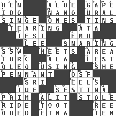 ACROSS 1. Layer 4. _ vera 8. Open wide 12. Wedding promise 13. Billionth: prefix 14. Mountain range 15. Burn superficially 18. Washington bills 19. Airtight sealed metal containers 20. Rending 22. "One Day ___ Time" 23. Trial 24. Australian flightless bird 25. Area sheltered from the wind 26. Catching in a trap 30. Compass dir. 33. Confronts 36. Type of rug 37. Torque (variant) 39. In the manner of 40. For fear that 41. Margarine 42. Putting into practice 44. A female animal or person 45. Pre-World Series prize 47. Order of Saint Francis (abbr.) 50. Indian title of respect (Mr.) 51. Snakelike fish 53. Third day of the wk. 54. French poetic form 57. Demure 59. Came down and settled, as after flight 61. Took without asking 63. Travel on or in a vehicle 64. A blast of a horn 65. To riddle 66. Wrote a lyric poem 67. Inactive volcano in Sicily 68. Nine, plus one DOWN 1. Part of HMS, perhaps 2. Prepare for publication 3. Music written for nine 4. At once, immediately (arch.) 5. Austrian-born American filmmaker Fritz 6. Single 7. Greek goddess of the dawn 8. From the throat 9. Operatic vocal solo 10. Baking dish 11. Raised railways 16. Highlander 17. Celtic language 21. A distinct part 22. Nanny (var.) 24. Followers of ems 26. Comedian Laurel of Laurel & Hardy 27. Angers 28. Soft 29. Yard entry 30. Constrict 31. Flatfish 32. Songbird 34. 90 degrees 35. Connecticut Ivy Leaguer 38. Eaten 42. Single; one (prefix) 43. Leaves 46. "We ___ not amused" (Victoria) 48. Puts into a specified state 49. Secret move to avoid paying debts 52. Derisive sound 53. Periodic rise and fall of the sea level 54. The Jewish people; Israel 55. Singer James 56. Toward shelter 57. Adept person 58. To free from 59. Had dinner 60. Car dealer's back yard 62. Car or cant ending