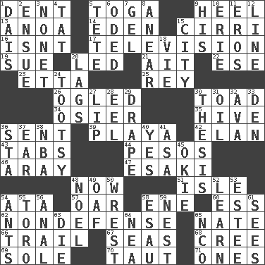 ACROSS 1. Gouge 5. Ancient Roman robe 9. The bottom of a shoe or boot 13. Small Philippine buffalo 14. Genesis locale 15. High-altitude cloud 16. Is not 17. Household entertainment appliance 19. Institute legal proceedings 20. Directed 21. Small island 22. Compass dir. 23. Singer James 25. Marina Del _, California 26. Stared at amorously 30. Frog relative 34. Flexible twig of a willow tree 35. Hub of activity 36. Transmitted 39. Beach, in Buenos Aires 42. Flair 43. Bar bills 44. Mexican monetary units 46. Like ___ of sunshine 47. 1973 Nobel Price Winner (Physics) Leo 48. Immediately 51. Small island 54. _ moment's notice (2 wds.) 57. Rowing implement 58. Compass dir. 60. Double-curved letter 62. Unrelated to defense, as in spending 65. Nathan's nickname 66. Get behind 67. Oceans 68. Algonquian 69. Not divided or shared with others 70. Drawn tight 71. Singles DOWN 1. Raised platform 2. Follow as a consequence or result 3. Music written for nine 4. Make lace 5. False hair 6. Wrote a lyric poem 7. Set 8. Approach 9. Part of HMS, perhaps 10. 4th largest of the Great Lakes 11. Greek god of love 12. Actor's bit 15. Municipality 18. Compete 20. Straggles 24. Tootsie (variant) 27. Mouth edge 28. Snakelike fish 29. Window treatment 30. College paper 31. Petroleum 32. Actress Gardner 33. Lair 36. R.R. building 37. Hearing organ 38. Basketball assoc. 40. Affirmative reply 41. White ___ sheet 45. Migrant worker of the '30s 48. Christmas carol 49. Clumsy lout 50. Obtain by seizing forcibly or violently 52. Memorize 53. First name in cosmetics 54. Pismires 55. "Corrida" creature 56. Of or related to the anus 58. He sold his birthright 59. Egg locale 61. Perceives with the eye 63. Pass on 64. Teachers' org. 65. Non-commissioned officer (abbr.)