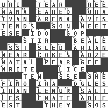 ACROSS 1. RI univ. 4. Pull apart 8. To separate or throw off 11. Grandmother 13. Having ears or earlike features 15. Mouth or opening 16. _ the terrible 17. Sports stadium 18. Deliberation 19. Looks after 21. Male offspring 22. Confront 23. Compass dir. 24. Wedding promise 27. Republican Party 29. Tumult 30. Memphis, Tenn. Street 34. Fast jet (abbr.) 36. Downhill vehicle 39. Believer in; advocate of (suffix) 40. Erode 41. Popular sodas 43. Axlike tool, used for shaping wood 44. Relating to or accompanying birth 46. Lightbulb-shaped fruit 47. Turn to the right 48. Compose 49. Louse (plural) 51. "___ Little Indians" 53. Compass dir. 54. A female animal or person 57. A pale, very dry sherry 60. Lyricist Gershwin 63. Stares at amorously 65. SW Asia republic 66. Arboreal primate 69. Table seasoning 70. French article 71. Related on the mother's side 72. Competent 73. Eastern Standard Time (abbr.) 74. Those things 75. Mayday DOWN 1. Join together 2. All-night dance parties 3. Silly 4. Afternoon social gathering 5. Hearing organ 6. Ancient Greek god of war 7. Former U.S. Attorney General Janet 8. Be footloose 9. One of the Great Lakes 10. Compass direction 12. Also 14. Mild oath, euphamism for damn 18. Electrical Measurement 20. Be seated 25. Compact _ 26. Fourth or lowest deck 28. Chief or king in Benin or Nigeria 29. Ski resort town in Vermont 31. Helper 32. Goldbrick 33. Compass dir. 34. Wither 35. Suttee (variant) 37. Make supply last 38. Allots cards 40. Compass dir. 42. Indian titles of respect 45. Area sheltered from the wind 50. Corporate head (abbr.) 52. The longest river in the world 54. Thick slices 55. Phone greeting 56. _____ Park, CO 57. Do some clerical work 58. Angers 59. Political cartoonist Thomas 61. Monthly bill 62. Nanny 64. Girls' org. (abbr.) 67. Shoshoni 68. Marina Del _, California