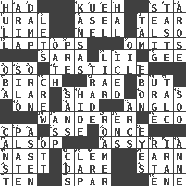 ACROSS 1. Possessed 4. Malaysian steamed pastry 8. R.R. building 11. Mountain range 13. At sea 14. Pull apart 15. Citrus frut 16. 1994 drama film starring Jodie Foster 17. In addition 18. Portable computers 21. Leaves out 22. "Two Mules for Sister ____" 23. Cards in a Roman deck? 25. Turn to the right 26. Bear (Spanish) 29. A testis 32. A tree used for making furniture 34. Actress Charlotte 35. Yet 38. Having or resembling wings 39. Broken piece 41. Mouths or openings 43. Single 44. Help 45. White American of non-Hispanic descent 46. Roamer 50. Environmental prefix 51. Accounting whiz (abbr.) 54. Compass dir. 55. Single time 57. Columnist Joseph or Stewart 59. Nineveh was its capital 63. Political cartoonist Thomas 64. Clement's nick name 67. Merit 68. Proofreading order 69. Have the gumption 70. Comedian Laurel of Laurel & Hardy 71. Nine, plus one 72. Coast Guard woman 73. Compass dir. DOWN 1. Frame or body of a ship 2. Roberta Peters solo 3. Moist 4. Sunflower state 5. Purpose 6. Snakelike fish 7. Actor Linden 8. Major League Baseball Commissioner Bud 9. Clothes sense 10. Came up 12. Allows 14. Scottish cap 19. Pledge 20. Before (prefix) 21. Petroleum 23. One who doesn't tell the truth 24. On the rocks 26. Chief or king in Benin or Nigeria 27. Grain storage tower 28. Northwest Algerian city 30. Barter 31. Inky black, to poets 33. Ship's personnel 36. Goad 37. Baby powder 39. Without 40. Flintstone garb 42. "Barney Miller" actor Jack 45. Arches 47. Cleo's killer 48. Wanderer 49. Followers of ems 51. 2nd pers. sing. pres. of can (arch.) 52. Food holder 53. NE Netherlands city 56. Sight organs 58. Baseball player Mel 60. Pace 61. SW Asia republic 62. Singer Murray 64. Music discs 65. Infant locale 66. Epoch