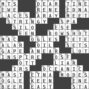 ACROSS 1. Mountains (abbr.) 4. Letter starter 8. Prong on a fork 12. She-sheep 13. French philosopher Descartes 14. Pulitzer Prize-winning author Ferber 15. Shoestrings 18. Like ___ of sunshine 19. Confront 20. Slender, wiry 22. Health resort 23. Grain storage tower 24. Compass dir. 25. Car or cant ending 26. The distance a bow sends an arrow 30. Big _ 33. Stares at amorously 36. False hair 37. Having or resembling wings 39. Petroleum 40. Puts into a specified state 41. Open wide 42. Approach 44. Car dealer's back yard 45. Heighten or intensify 47. Order of Saint Francis (abbr.) 50. Baseball player Mel 51. One who doesn't tell the truth 53. Big collection agency 54. Pertaining to the sea 57. Vertical spar for supporting sails 59. Inactive volcano in Sicily 61. Methods 63. Stare 64. Peachy ____! 65. Compass dir. 66. Fermented drink made from hops 67. Compass direction 68. R.R. building DOWN 1. Cartoonist voice _ Blanc 2. It was, poetically 3. Religious groups 4. To trail on the ground 5. Suggestive of the supernatural 6. Santa ___, CA 7. Marina Del _, California 8. Storms 9. The content of cognition 10. Compass dir. 11. Erode 16. 4th largest of the Great Lakes 17. Drop; flow; fall 21. Words to Nanette 22. Compass dir. 24. Greek goddess of the dawn 26. Actor Lugosi 27. Person who is morally reprehensible 28. Von Bismarck 29. Trial 30. Wise men 31. ____ Jay Lerner 32. Balmoral and tarboosh 34. Went 35. Falsehood 38. Newsperson 42. Nonscientific branch of learning 43. Hero or heavy, e.g. 46. ___ a Wonderful Life 48. Thailand, formerly 49. Papal veil 52. Amusement-park features 53. Small island 54. Washington bills 55. Patter 56. Penny 57. Crowd into 58. Ripen 59. Make supply last 60. Beverage made from leaves 62. Ocean
