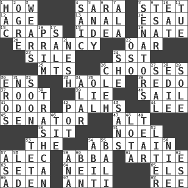 ACROSS 1. Cut the grass 4. "Two Mules for Sister ____" 8. Proofreading order 12. Mature 13. Of or related to the anus 14. Son of Isaac 15. Dice game 18. The main thing one is thinking about 19. Nathan's nickname 20. The state or an instance of erring 22. Rowing implement 23. Filth; sediment 24. Fast jet (abbr.) 25. Mountains (abbr.) 26. Opts 30. Followers of ems 33. White Person, in Hawaii 36. Make new 37. Carrot, for example 39. Untruth 40. Move on water 41. Aroma 42. Insides of hands 44. Area sheltered from the wind 45. Legislator 47. The first octave above the treble staff 50. Be seated 51. Christmas carol 53. Definite Article 54. Choose not to consume 57. Actor Baldwin 59. Swedish rock group 61. Nick name for Arthur 63. Bristle 64. Famous astronaut Armstrong 65. Raised railways 66. Arabian gulf 67. Against 68. To separate or throw off DOWN 1. Big _ 2. Legendary monster 3. Puts on (as clothing) 4. Ketch in the Levant 5. "60 Minutes" Commentator Rooney 6. Actress Charlotte 7. In the manner of 8. Legislators 9. Russian ruler of old 10. Erode 11. Third day of the wk. 16. Demure 17. Table seasoning 21. Soft 22. Bear (Spanish) 24. A female animal or person 26. Clement's nick name 27. Lick closed 28. Singer Brickell 29. Flatfish 30. Greek god of love 31. Connecting point 32. Within a short period 34. Having or resembling wings 35. Petroleum 38. File 13 42. Plant holder 43. Without 46. Standoff 48. Globular water bottle used in Asia 49. Pull apart 52. 61 cubic inches 53. False hair 54. "This won't hurt ____!" 55. Indonesian resort city 56. The longest river in the world 57. White ___ sheet 58. Directed 59. Santa ___, CA 60. Benjamin's nick name 62. Compass dir.