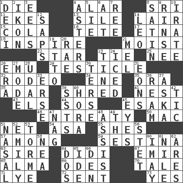 ACROSS 1. Pass on 4. Having or resembling wings 8. _ Lanka 11. Supplements with great effort 13. Filth; sediment 14. Den 15. Root beer relative 16. False hair 17. Inactive volcano in Sicily 18. Heighten or intensify 21. Damp 22. Play the lead 23. Make a knot 25. Born 26. Australian flightless bird 29. One of the two male reproductive glands 32. Cowboy competition 34. Compass dir. 35. Mouth or opening 38. The sixth month of the Jewish calendar 39. Fragment 41. A home for chicks 43. Raised railways 44. Distress signal 45. 1973 Nobel Price Winner (Physics) Leo 46. Plea 50. Apple computer (short form) 51. Fish or hair follower 54. White ___ sheet 55. "______ My Girl" (Turtles hit) 57. Amid 59. French poetic form 63. Title for a man of rank and authority 64. "You Light Up My Life" star Conn 67. Independent ruler or chieftain 68. _ mater 69. Lyric poems 70. Lie 71. Sodium hydroxide 72. Posted 73. Consenting reply DOWN 1. Tenth: prefix 2. Image 3. Snakelike fish 4. Michaelmas daisies 5. Whopper 6. The first octave above the treble staff 7. To riddle 8. Smooth fabric 9. Remove soap 10. Feeling or showing extreme anger 12. Plant excrements 14. Lion 19. "Tell ____ the Marines!" 20. Actress Charlotte 21. Cartoonist voice _ Blanc 23. Prong on a fork 24. On the rocks 26. Period 27. Method 28. Freehold land 30. Laconic 31. Immeasurably long periods of time 33. Celtic language 36. 480, 500 or 516 sheets of paper 37. "____ silly question..." 39. Fast planes 40. Israeli folk dance 42. Nervous spasm 45. Sight organs 47. Tired old horse 48. Aid 49. Definite Article 51. Rhinal 52. Poet Dickinson 53. Singer Mel 56. Proofreading order 58. Teachers' org. 60. "If ____ say so..." 61. Mediterranean tributary 62. Ancient Greek god of war 64. Two (Sp.) 65. Binary compound 66. Lair