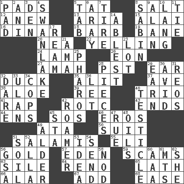 ACROSS 1. Writing tablets 5. Make lace 8. Table seasoning 12. Afresh 13. Roberta Peters solo 15. Mountain range southwest of Kyrgyzstan 16. Middle Eastern gold or silver currency 18. Sharp remark 19. Object of repulsion 20. Teachers' org. 22. Crying or shouting loudly 24. Desk light 26. A really long time 27. Housemaid 28. Pacific Standard Time (abbr.) 29. Ewer handle 32. Evade 35. Set down 37. "___ Maria" 38. Medicinal plant 39. To sift 40. Musical group of three 41. Hit sharply and swiftly 42. College mil. group 43. Conclusions 44. Followers of ems 45. Distress signal 46. Greek god of love 49. _ moment's notice (2 wds.) 50. Set of matching outer garments 51. Deli grouping 55. Biblical high priest 56. Aureate 57. Genesis locale 59. Fraudulent business schemes 63. Filth; sediment 64. Western Nevada city 65. Thin strip of wood or metal 66. Having or resembling wings 67. Say or write further 68. Comfort DOWN 1. Writing tablet 2. Black tropical American cuckoo 3. Lair 4. Tchaikovsky ballet 5. Bar bill 6. Like ___ of sunshine 7. Become fatigued 8. Unit of acoustic absorption 9. ____ Jay Lerner 10. Long (Scottish) 11. Make a knot 14. Most capable 17. 480, 500 or 516 sheets of paper 21. Housemaid (var.) 23. Car dealer's back yard 25. N Egypt peninsula 28. Parts 29. Merit 30. Enthusiastic 31. Vintage cars 32. Have the gumption 33. ____ Bator, Mongolia 34. 911 reaches them 36. Allow 40. One of the two male reproductive glands 42. Wanderer 45. R.R. building 47. Sorrow 48. Petroleums 49. Tree or shrub in the Birch family 51. The visible part of the earth's surface 52. Silent film actress Nazimova 53. The main thing one is thinking about 54. Transmit 56. Girls' org. (abbr.) 58. Lower and raise head in agreement 60. Auto club (abbr.) 61. Mountains (abbr.) 62. A female animal or person