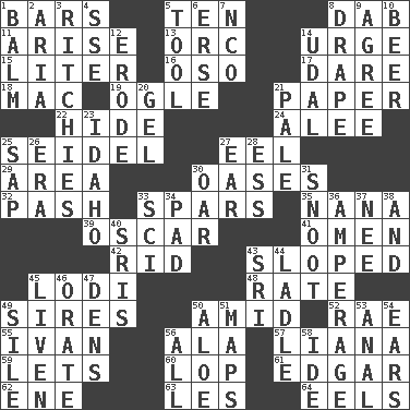 ACROSS 1. Oblong pieces of solid material 5. Nine, plus one 8. Pat or tap gently 11. Ascend 13. The grampus (Milton) 14. Goad 15. 61 cubic inches 16. Bear (Spanish) 17. Have the gumption 18. Big _ 19. Stare at amorously 21. Some stationery 22. Flintstone garb 24. Toward shelter 25. Beer mug 27. Snakelike fish 29. Length times width 30. Fertile tracts in a desert 32. Romantic infatuation 33. Practice fights 35. Grandmother 39. Witty Wilde 41. Presage 42. To free from 43. Inclined 45. Farming town in central California 48. Assign a rank or rating to 49. Founders of families 50. Among 52. Actress Charlotte 55. "Terrible" tsar 56. Wing 57. Woody, climbing, usually tropical plant 59. Allows 60. Trim (branches) 61. _ Allan Poe 62. Compass dir. 63. French article 64. Snakelike fish DOWN 1. Lip ointment 2. Roberta Peters solo 3. Actors Guy, Robert Welles, and Clint 4. Compass dir. 5. Instrument 6. Celtic language 7. Non-commissioned officer (abbr.) 8. Window treatment 9. Match 10. Fermented drink made from hops 12. Wear away 14. Freehold land 20. Set 21. Diluted with white 23. Potato state 25. Plant excrement 26. Epoch 27. Hearing organ 28. Double-curved letter 30. Rowing implement 31. Snob 33. _-fi 34. Writing tablet 36. Electrical Measurement 37. Born 38. Added to 40. Indian titles of respect 43. Indian title of respect (Mr.) 44. Dipping utensil 45. Make or become more lively 46. Speak pompously 47. Habitations of wild animals 49. Drop; flow; fall 50. _ vera 51. Atlas contents 53. Of or related to the anus 54. Hearing organs 56. Everything 58. Binary compound