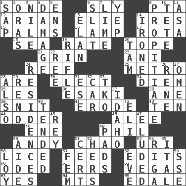 ACROSS 1. Something which is sent 6. Roguish 9. Parent Teacher Association (abbr.) 12. Believer in; advocate of (suffix) 13. Writer Wiesel 14. Angers 15. Insides of hands 16. Desk light 17. Round or rotation of duties 18. Ocean 19. Assign a rank or rating to 20. Drink excessively 21. Amused look 23. Black tropical American cuckoo 24. Coral collection 25. Paris' subway 28. "We ___ not amused" (Victoria) 30. Voters do this 34. South Vietnam president (1954) 35. French article 36. 1973 Nobel Price Winner (Physics) Leo 38. One (Scot) 39. In a ____ (agitated or irritated) 41. Wear away 43. "___ Little Indians" 44. More peculiar 46. Toward shelter 48. Compass dir. 49. Silvers or Donahue 50. Actor Griffith 51. US Secretary of Labor Elaine L. _ 53. RI univ. 56. Louse (plural) 57. Nourish 58. Prepares for publication 60. Wrote a lyric poem 61. Blunders 62. Viva Las _ 63. Affirmative reply 64. Mountains (abbr.) 65. Peak District village in England DOWN 1. Plant excrement 2. Mouths or openings 3. Mediterranean tributary 4. Break 5. Followers of ems 6. Narrow board 7. Citrus frut 8. Slangy assent 9. Appease 10. False hair 11. White ___ sheet 13. Style 14. Pressed 19. Firearm 20. Scottish cap 22. Portuguese money of account (variant) 24. Homes 26. French philosopher Descartes 27. Presage 28. In addition 29. Tear apart 31. Compass dir. 32. Automobile 33. Ring climax 37. Potato state 40. Looked after 42. Connecticut Ivy Leaguer 45. Marina Del _, California 47. Dodged 49. Writing tablets 50. Assistant 51. An absolute certainty 52. Possessive pronoun 54. Port city in Latvia 55. Slanted text style (abbr.) 56. Myrna of the movies 57. Opposite of masc. 58. Night before a holiday 59. Compass dir.