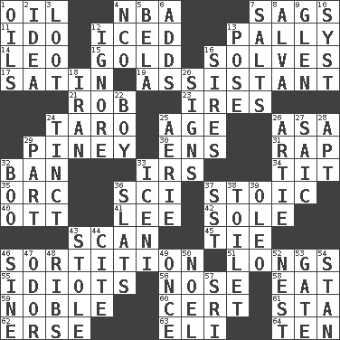 ACROSS 1. Lubricate 4. Basketball assoc. 7. Settles 11. Wedding promise 12. On the rocks 13. Friendly 14. Lion 15. Precious metal 16. Finds the solution 17. Smooth fabric 19. Aide 21. Director Reiner 23. Angers 24. Pacific island yam 25. Mature 26. White ___ sheet 29. Abounding in pines 30. Followers of ems 31. Hit sharply and swiftly 32. Prohibit 33. Big collection agency 34. Teat (slang) 35. The grampus (Milton) 36. _-fi 37. Unemotional 40. Baseball player Mel 41. Area sheltered from the wind 42. Not divided or shared with others 43. Skim 45. Neckwear 46. Decision 51. Yearns 55. Foolish or stupid persons 56. Olfactory organ 58. Erode 59. Having high moral qualities 60. Sure thing 61. R.R. building 62. Celtic language 63. Biblical high priest 64. "___ Little Indians" DOWN 1. Lubricates 2. The main thing one is thinking about 3. Plunder 4. Non-commissioned officer (abbr.) 5. Actor Lugosi 6. Sums up 7. Table seasonings 8. Inventor's middle name 9. Small, secluded valley 10. System (abbr.) 12. Disregard 13. Airs 16. Titles for men of rank and authority 18. SW Asia republic 20. Public displays of written messages 22. Male child 24. Tinged 25. Nest on high 26. Nick name for Arthur 27. Ketch in the Levant 28. Fitting 29. Component 32. Oct. 31 cry 33. Ancient Celtic tribe of eastern Britain 36. Narrow boards 37. Fast jet (abbr.) 38. Bathroom 39. Margarine 43. Fur scarf 44. Quote 46. Trig term 47. Aroma 48. Teases 49. At one time in the past 50. Christmas carol 52. Egg locale 53. Yard entry 54. Comedian Laurel of Laurel & Hardy 57. Indian title of respect (Mr.)