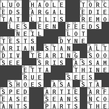 ACROSS 1. Nilotic language 4. White Person, in Hawaii 9. Torque (variant) 13. Begley and Asner 14. Therefore, facetiously 15. Singer Brickell 16. Make lace 17. Ms. Damita and namesakes 18. San ____ (Riviera town) 19. French article 21. Car or cant ending 22. Gives food to 24. Famous astronaut Armstrong 26. Car dealer's back yard 27. Trials 29. Centimeter-gram-second unit of force 30. Believer in; advocate of (suffix) 31. Comedian Laurel of Laurel & Hardy 33. The first octave above the treble staff 36. HTML Container Element 37. Separating forcefully 40. "Barney Miller" actor Jack 41. Perceive with the eye 42. Indian titles of respect 43. Indian state 45. Singer James 47. One or ones belonging to thee 48. Regret 49. Observes 50. Imelda's hoard 52. White ___ sheet 54. R.R. building 56. Broke a traffic law 57. Nick name for Arthur 59. Sandy's bark 61. Relaxation 62. Seines 63. Non-commissioned officer (abbr.) 64. Pismires 65. Pieces 66. Definite Article DOWN 1. Allow 2. Freehold land 3. Clearly or manifestly demonstrative 4. Actor Linden 5. Satellite of Uranus 6. Stare at amorously 7. (Had) reclined 8. Raised railways 9. Cylindrical with tapered ends 10. Wrote a lyric poem 11. Basketball hoops 12. Corporate head (abbr.) 20. Bristle 22. Film actor Errol 23. Period of immesurable duration 25. Is not 27. Small amounts or degrees 28. 4th largest of the Great Lakes 29. Raised platform 31. "Two Mules for Sister ____" 32. Three (prefix) 33. Aide 34. Grant temporary use of 35. Heavy book 38. _____ Park, CO 39. Yard entry 44. "______ My Girl" (Turtles hit) 45. Eats (away) 46. Third day of the wk. 49. Virtuous person 50. Connect, as a bridge 51. Command 52. Length times width 53. Play the lead 55. Bowlike part 56. Ocean 57. Viper 58. Double-curved letter 60. Enemy