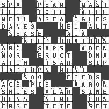 ACROSS 1. Health resort 4. Lightbulb-shaped fruit 8. Political cartoonist Thomas 12. Pipe bend 13. Carry 14. Toward shelter 15. Famous astronaut Armstrong 17. At sea 18. Stares at amorously 19. Natives or inhabitants of Denmark 21. Cartoonist voice _ Blanc 23. Keyboard modifier key 24. Gospel singer Marvin 26. Chicken ___ king 28. Seaweed 30. Speakers 34. Curve 37. Plant excrements 39. An important port of Yemen 40. Not either 41. Spew [out] 43. Heredity factor (abbr.) 44. Tiny particle 46. Russian ruler of old 47. Small drink 48. Portable computers 51. Respite 54. "Barney Miller" actor Jack 55. Eats 58. Adept person 61. Sliced dessert 63. Composer Copland 65. Imelda's hoard 67. Having or resembling wings 71. Trig term 72. Coop moms 73. Beget 74. Begley and Asner 75. Celtic language 76. Wig 77. Arrange properly for use DOWN 1. Post 2. Entreaties 3. Place in a line 4. Parent Teacher Assoc. 5. Greek goddess of the dawn 6. Had dinner 7. 480, 500 or 516 sheets of paper 8. Tired old horse 9. Silent film actress Nazimova 10. Stitch closed the eyes of (a falcon) 11. Trial 16. Path through which fluid escapes 18. Water jar 20. Compass dir. 22. Ewer handle 25. Otherwise 27. "One Day ___ Time" 29. Actors' quests 30. Witty Wilde 31. Likelihood 32. Painter Guido (1575-1642) 33. Fastener 34. Of or related to the anus 35. Roll call or roster of names 36. Riding implement 38. Product of festering 42. Unclean, religiously 45. Mountains (abbr.) 49. I made a mistake 50. Luau course 52. Ocean 53. Beverages made from leaves 56. Frees from moisture 57. Something which is sent 58. American tennis player Robert 59. "Mermaids" star 60. Immeasurably long periods of time 62. 90 degrees 64. A home for chicks 66. Compass dir. 68. Untruth 69. Nonscientific branch of learning 70. To sift