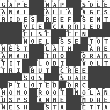 ACROSS 1. Yawn 5. Atlas unit 8. Flatfish 12. Of or related to the anus 13. Silent film actress Nazimova 15. Grows older 16. Amusement-park features 18. Coral collection 19. Posted 20. Compete 22. Borne 24. Otherwise 26. Car or cant ending 27. Christmas carol 28. Compass dir. 29. Small child 32. 270 degrees 35. Thin strip of wood or metal 37. "We ___ not amused" (Victoria) 38. Wet nurse 39. Wedding promise 40. Northwest Algerian city 41. Teat (slang) 42. Farming town in central California 43. Electrical Unit 44. Three (prefix) 45. Yet 46. Algonquian 49. Distress signal 50. Fly high 51. Manned the helm 55. The grampus (Milton) 56. Like (prefix) 57. Carrot, for example 59. Pitcher Ryan 63. United States Postal Service (abbr.) 64. Queen of England 1702-14 65. Greater amount 66. Delicate 67. R.R. building 68. Singer James DOWN 1. Slender fish 2. Cuckoo 3. Writing tablet 4. Veterans Day date 5. Third mo. 6. Actor Baldwin 7. Entreaty 8. Indian antelope 9. Double curve, resembling the letter S 10. Grant temporary use of 11. Eastern Standard Time (abbr.) 14. Anew 17. Grain storage tower 21. Compass dir. 23. Portuguese money of account (variant) 25. American author Paul (1891-1958) 28. Unemotional ones 29. Pacific island yam 30. Of the mouth 31. Portable shelter 32. Electrical Unit 33. Arab leader 34. Suttee (variant) 36. Increase 40. Conquer 42. A period of five years 45. Surprise greeting 47. Friend of Pooh 48. Merit 49. Make a splashing sound 51. Introduce or present, as a question 52. Naughty children 53. Immeasurably long periods of time 54. Do not 56. Attila the _ 58. Beverage made from leaves 60. Car dealer's back yard 61. Nonscientific branch of learning 62. Teachers' org.