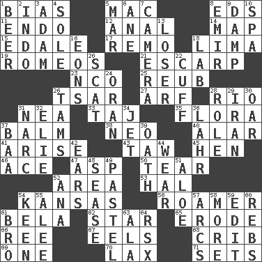 ACROSS 1. Prejudice 5. Big _ 8. Begley and Asner 11. Inside; within (prefix) 12. Of or related to the anus 14. Atlas unit 15. Peak District village in England 17. San ____ (Riviera town) 18. Pale green bean 19. Lover boys 21. Fortification 23. Non-commissioned officer (abbr.) 25. Reuben's nickname 26. Russian ruler of old 27. Sandy's bark 28. River (Sp.) 31. Teachers' org. 33. _ Mahal 35. Plants 37. Lip ointment 38. Modern: prefix 40. Having or resembling wings 41. Get up 43. The 23rd letter of the Hebrew alphabet 45. Layer 46. Adept person 47. Viper 50. Pull apart 52. Length times width 53. Actor Linden 54. Sunflower state 56. Wanderer 61. Actor Lugosi 62. Play the lead 65. Eat (away) 66. To riddle 67. Snakelike fish 68. Baby bed with high sides 69. Single 70. Not strict 71. Arranges properly for use DOWN 1. Fermented drink made from hops 2. Southeast Asian peninsula 3. First of billions? 4. Not divided or shared with others 5. Impair 6. A saturated hydrocarbon 7. Device for capturing images 8. Independent ruler or chieftain 9. Moist 10. Health resort 13. Failure 16. Immeasurably long periods of time 18. Experiment locale 20. Leave at once 22. Sleeve end 24. Northwest Algerian city 26. Scottish caps 28. Hero or heavy, e.g. 29. SW Asia republic 30. Boat paddle 31. Drug cop 32. Writer Wiesel 34. Type of plane 36. Cowardly lion portrayer 37. Sound made by sheep 39. Pledge 42. Hearing organs 44. Put on (as clothing) 48. Gospel singer Marvin 49. Soft color 51. Medicinal plant 52. Santa ___, CA 54. Peachy ____! 55. Toward shelter 57. Curves 58. Greater amount 59. Prepare for publication 60. Confederate soldiers (slang) 61. Sis' sibling 63. Chicken ___ king 64. Acura sports coupe
