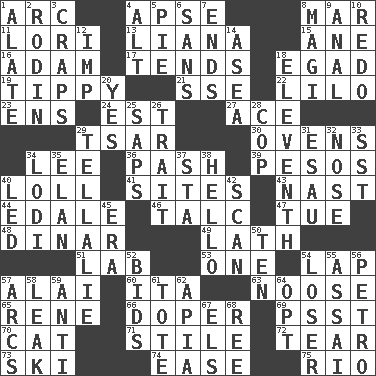 ACROSS 1. Curve 4. Domed church section 8. Third mo. 11. Australian parrot (variant) 13. Woody, climbing, usually tropical plant 15. A saturated hydrocarbon 16. First man 17. Watches over 18. Mild oath 19. Likely to tip or tilt 21. Compass dir. 22. _ and Stitch 23. Followers of ems 24. Eastern Standard Time (abbr.) 27. Adept person 29. Russian ruler of old 30. Baking chambers 34. Area sheltered from the wind 36. Romantic infatuation 39. Mexican monetary units 40. Hang loosely or laxly 41. Settings 43. Political cartoonist Thomas 44. Peak District village in England 46. Baby powder 47. Third day of the wk. 48. Middle Eastern gold or silver currency 49. Thin strip of wood or metal 51. Experiment locale 53. Single 54. Infant locale 57. Mountain range southwest of Kyrgyzstan 60. Call ___ day 63. Trap for birds or small mammals 65. French philosopher Descartes 66. Drug addict 69. Inconspicuous attention getter 70. Feline 71. Vertical member of a panel or frame 72. Lacerate 73. What Jean-Claude Killy likes to do 74. Comfort 75. River (Sp.) DOWN 1. Having winglike extensions 2. "The Thinker" sculptor 3. Dice game 4. Keyboard modifier key 5. Sliced dessert 6. Without 7. Conclusions 8. Wise men 9. Of or related to the anus 10. Make new 12. Mischievous child 14. At sea 18. Veterans Day date 20. Consenting reply 25. Plant excrements 26. Distinguishing feature 28. Police officer (slang) 29. Copy Pinocchio 31. He sold his birthright 32. Olfactory organ 33. Fast jet (abbr.) 34. Farming town in central California 35. Style 37. R.R. building 38. Phone greeting 40. Directed 42. Glance over 45. Epoch 50. "___ Little Indians" 52. Auction offers 54. Failure 55. Slender Brazilian palm 56. Stone: prefix 57. Curves 58. Path through which fluid escapes 59. Against 61. Carryall 62. Capital of Western Samoa 64. Choose 67. Raised railways 68. Portuguese money of account (variant)