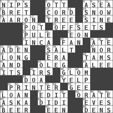 ACROSS 1. Cuts off 5. Baseball player Mel 8. Toward the sea 12. Cy Young winner Saberhagen 13. Drawstring 15. Overwhelm 16. Composer Copland 18. Family _ (genealogy) 19. Trig term 20. Cooking vessel 22. Cancels 24. Whine 26. Period of immesurable duration 27. South American Indian 28. Air blower 29. Had dinner 32. Arabian gulf 35. Table seasoning 37. And not 38. Protracted 39. Period 40. Scottish caps 41. Also 42. Cassini of fashion 43. Toward shelter 44. It is 45. Big collection agency 46. Take by theft 49. ___ good deed 50. Sharp bark 51. Hard copy producer 55. Turn to the right 56. Grant temporary use of 57. Prepare for publication 59. Declaim 63. "____ silly question..." 64. "You Light Up My Life" star Conn 65. Nights before holidays 66. Fermented drink made from hops 67. Car or cant ending 68. Lairs DOWN 1. Basketball assoc. 2. Lyricist Gershwin 3. For each 4. Obstructing or blocking passage 5. Sep. follower 6. "Corrida" creature 7. Unclean, religiously 8. NE Netherlands city 9. In a ____ (agitated or irritated) 10. Immeasurably long periods of time 11. Deep reverence 14. Outscore 17. Part of speech 21. Affectionate concern, for short 23. Boy, to dad 25. Artist's stands 28. Tasteless 29. Of or related to the anus 30. Heavy book 31. Celtic language 32. Mountain range southwest of Kyrgyzstan 33. Do not 34. Extremities 36. "We ___ not amused" (Victoria) 40. ________ with (broke a safety seal) 42. Spoke pompously 45. Electrically charged atom 47. Part of a journey 48. Margarine 49. Middle Eastern gold or silver currency 51. Introduce or present, as a question 52. Libertine 53. Singer Brickell 54. Travel on or in a vehicle 56. Experiment locale 58. Shallow baking pan 60. "___ Maria" 61. "___ Little Indians" 62. Double-curved letter