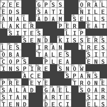 ACROSS 1. Last letter of the English alphabet 4. Global Positioning Systems (abbr.) 8. Relating to the mouth 12. Begley and Asner 13. Suttee (variant) 14. Mediterranean tributary 15. Of or related to the anus 17. First man 18. Makes a sale 19. Member of a famous L.A. basketball team 21. For each 23. Erode 24. Locates 26. Mouth edge 28. Post 30. Smoochers 34. French article 37. SW Asia republic 39. Angers 40. Chief or king in Benin or Nigeria 41. Lies 43. Be seated 44. 911 reaches them 46. Entreaty 47. Followers of ems 48. Motivate 51. Overwhelm 54. Adept person 55. Connects, as a bridge 58. Before (prefix) 61. Sight organ 63. Heavy duty weighing machine 65. First course 67. Highlander 71. Fly high 72. Comedian Laurel of Laurel & Hardy 73. Johnson of "Laugh-In" 74. Title for a knight 75. Be inclined (to) 76. Tenth: prefix 77. Raised railways DOWN 1. Ardor 2. Ferber et al. 3. 1973 Nobel Price Winner (Physics) Leo 4. Girls' org. (abbr.) 5. Writing tablet 6. R.R. building 7. Simple or foolish person 8. Single 9. Cause heat under the collar 10. Silent film actress Nazimova 11. For fear that 16. Allows 18. Indian titles of respect 20. To sift 22. Connecticut Ivy Leaguer 25. In a ____ (agitated or irritated) 27. Air pressure measure (abbr.) 29. Window treatment 30. Leg joints 31. Celtic language 32. It's straight from the horse's mouth 33. Fast planes 34. Venues 35. Inky black, to poets 36. Plant excrements 38. 100% 42. Without 45. Health resort 49. On the rocks 50. Marina Del _, California 52. Choose 53. Armed conflicts 56. Trap for birds or small mammals 57. Slow-paced one 58. Inconspicuous attention getter 59. Pace 60. Flair 62. Mild oath 64. Blunders 66. Plus 68. "We ___ not amused" (Victoria) 69. And so on (abbr.) 70. Flowery wreath