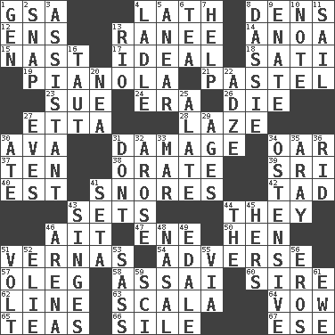 ACROSS 1. Girls' org. (abbr.) 4. Thin strip of wood or metal 8. Cub Scout units 12. Followers of ems 13. The wife of a rajah (variant) 14. Small Philippine buffalo 15. Political cartoonist Thomas 17. Standard of perfection 18. Suttee (variant) 19. Player piano 21. Soft color 23. Institute legal proceedings 24. Epoch 26. Expire 27. Singer James 28. Goldbrick 30. Actress Gardner 31. Break 34. Boat paddle 37. Nine, plus one 38. Speak pompously 39. Indian title of respect (Mr.) 40. Eastern Standard Time (abbr.) 41. Sounds asleep 42. Bit 43. Puts into a specified state 44. Those people 46. Small island 47. Compass dir. 50. Layer 51. Actresses Bloom and Felton 54. Contrary to your interests or welfare 57. Cassini of fashion 58. Slender Brazilian palm 60. Father 62. Actor's bit 63. Any of the three canals of the cochlea 64. Promise 65. Afternoon social gatherings 66. Filth; sediment 67. Compass dir. DOWN 1. Commissioned mil. rank 2. Fastener 3. Aide 4. Dipping utensil 5. Approach 6. Afternoon social gathering 7. Assist 8. Small ungulate mammals of Africa 9. Maternal 10. Brief written record 11. Travel by water 13. River (Sp.) 16. Pulled tight 20. Teachers' org. 22. Axlike tool, used for shaping wood 25. Having winglike extensions 27. Nights before holidays 29. Matures 30. Had dinner 31. Do not 32. Came up 33. Spoil 34. Clearly or manifestly demonstrative 35. Like ___ of sunshine 36. To free from 41. Bristle 43. Burns superficially 44. Definite Article 45. Possessive pronoun 46. Sports stadium 48. Relating to the nose 49. Peak District village in England 51. Electrical Unit 52. Writer Wiesel 53. Backtalk 55. By way of 56. Greek god of love 59. _-fi 61. She-sheep