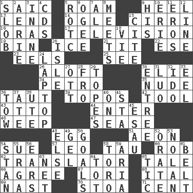 ACROSS 1. Ketch in the Levant 5. Wander 9. The bottom of a shoe or boot 13. Grant temporary use of 14. Stare at amorously 15. High-altitude cloud 16. Mouths or openings 17. Household entertainment appliance 19. Storage container 20. Frozen water 21. Teat (slang) 22. Compass dir. 23. Snakelike fish 25. Observe 26. At or to great height 30. Writer Wiesel 34. Stone: prefix 35. Unadorned 36. Strained 39. Traditional theme or motif 42. Instrument 43. "Beetle Bailey" pooch 44. Keyboard key 46. Shed a tear 47. Gospel singer Marvin 48. Oval reproductive body of a fowl 51. A really long time 54. Take to court 57. Lion 58. The 19th letter of the Greek alphabet 60. Director Reiner 62. Interpreter 65. Story 66. Match 67. Australian parrot (variant) 68. Slanted text style (abbr.) 69. Political cartoonist Thomas 70. Portico 71. Penny DOWN 1. Messy guy 2. Nest on high 3. Lacking in sense or substance 4. Music discs 5. College mil. group 6. Double curve, resembling the letter S 7. 100% 8. Confronts 9. Part of HMS, perhaps 10. One of the Great Lakes 11. Greek god of love 12. Actor's bit 15. Quote 18. Compete 20. Small island 24. Portable computer 27. Baseball player Mel 28. Away 29. Drinks excessively 30. Main course 31. Nilotic language 32. Wedding promise 33. Snakelike fish 36. Pull behind 37. Had dinner 38. Shoshoni 40. Single 41. R.R. building 45. He sold his birthright 48. Otherwise 49. Set 50. Finish lines 52. Speak pompously 53. Pitcher Ryan 54. Comedian Laurel of Laurel & Hardy 55. Capital and largest city of Mongolia 56. Hearing organs 58. "Corrida" creature 59. Roberta Peters solo 61. Waist strap 63. Remaining after all deductions 64. Small child 65. Nervous spasm