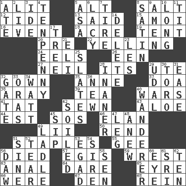 ACROSS 1. Set down 5. The first octave above the treble staff 8. Table seasoning 12. Event that recurs at intervals 13. Expressed in words 15. Mine, in Marseilles 16. Happening 18. 43,560 square feet 19. Portable shelter 20. Before (prefix) 22. Crying or shouting loudly 24. Snakelike fish 26. Car or cant ending 27. Famous astronaut Armstrong 28. ___ a Wonderful Life 29. Shoshoni 32. Bride's dress 35. Queen of England 1702-14 37. ___ good deed 38. Like ___ of sunshine 39. Beverage made from leaves 40. Armed conflicts 41. Make lace 42. Stitched 43. _ vera 44. Eastern Standard Time (abbr.) 45. Distress signal 46. Flair 49. Cards in a Roman deck? 50. Tear apart 51. Paper fasteners 55. Turn to the right 56. Passed on 57. Armor plate that protects the chest 59. Obtain by seizing forcibly or violently 63. Of or related to the anus 64. Have the gumption 65. Jane of fiction 66. Past tense of be (plural) 67. Lair 68. It's straight from the horse's mouth DOWN 1. Had dinner 2. 54 in ancient Rome 3. Binary compound 4. 3-inch nail 5. White ___ sheet 6. Made of lace 7. Hoop that covers a wheel 8. Smooth fabric 9. So be it 10. Yearn 11. Teat (slang) 14. Keyboard key 17. Family _ (genealogy) 21. Connecticut Ivy Leaguer 23. French article 25. Chalkboards 28. More lacking in sense or substance 29. Freehold land 30. "Corrida" creature 31. Relaxation 32. Yard entry 33. Mouths or openings 34. Electrical Unit 36. ___ Haven, CT 40. Roamer 42. Dirtied 45. Small drink 47. Part of a journey 48. Afresh 49. Dipping utensil 51. Trig term 52. Separate forcefully 53. Mild oath 54. Title for a man of rank and authority 56. Obsolete 58. Elected rep. 60. Sight organ 61. Indian title of respect (Mr.) 62. Nine, plus one