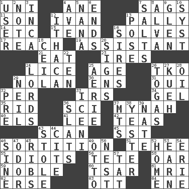 ACROSS 1. Corn or form start 4. A saturated hydrocarbon 7. Sinks 11. Manchild 12. "Terrible" tsar 13. Chummy 14. And so on (abbr.) 15. Watch over 16. Finds the solution 17. Arrive at 19. Aide 21. Ingest 23. Angers 24. Louse (plural) 25. Mature 26. Ring climax 29. Pitcher Ryan 30. Followers of ems 31. Fr. "Yes" 32. For each 33. Big collection agency 34. Set 35. To free from 36. _-fi 37. Non-adult bird? 40. Raised railways 41. Area sheltered from the wind 42. Afternoon social gatherings 43. Examine minutely or intensely 45. Fast jet (abbr.) 46. Drawing lots 51. Giggle 55. Foolish or stupid persons 56. Wig 58. Boat paddle 59. Having high moral qualities 60. Russian ruler of old 61. Medical imaging device (abbr.) 62. Celtic language 63. Baseball player Mel 64. Compass dir. DOWN 1. One who uses or employs something 2. Musical sound 3. South American Indian 4. "___ Maria" 5. Nanny 6. Conclusions 7. Table seasonings 8. Inventor's middle name 9. Small, secluded valley 10. System (abbr.) 12. New York city 13. Airs 16. Begets 18. To provide with a ceiling 20. Public displays of written messages 22. "___ Little Indians" 24. Domineers 25. Nest on high 26. Ancient Roman robes 27. Malaysian steamed pastry 28. Lubricate 29. Famous astronaut Armstrong 32. Before (prefix) 33. Ancient Celtic tribe of eastern Britain 36. Narrow boards 37. Mountains (abbr.) 38. Last 39. Nathan's nickname 43. Took without asking 44. Quote 46. Trig term 47. Aroma 48. Chest bones 49. "Beetle Bailey" pooch 50. Egg locale 52. Dwelling 53. Merit 54. One of the Great Lakes 57. Make lace