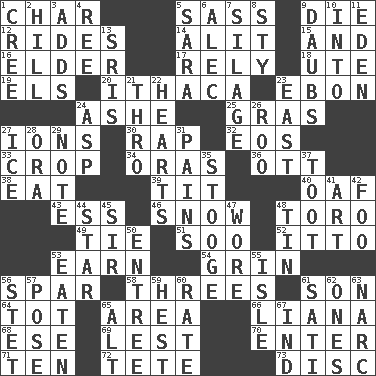 ACROSS 1. Burn to charcoal 5. Backtalk 9. Pass on 12. Amusement-park features 14. Set down 15. Plus 16. A person who is older than you are 17. Trust 18. Shoshoni 19. Raised railways 20. New York city 23. Inky black, to poets 24. American tennis player Robert 25. Pate de foie ____ 27. Charged particles 30. Reproach for some lapse or misdeed 32. Greek goddess of the dawn 33. Riding implement 34. Mouths or openings 36. Baseball player Mel 38. Erode 39. Teat (slang) 40. Clumsy lout 43. Curvy letter 46. Frozen precipitation 48. "Corrida" creature 49. Standoff 51. "Barney Miller" actor Jack 52. "Tell ____ the Marines!" 53. Merit 54. Smile widely 56. Practice fight 58. Threesomes 61. Manchild 64. Small child 65. Type of rug 66. Climbing, woody, usually tropical vines 68. Compass dir. 69. For fear that 70. Keyboard key 71. Nine, plus one 72. Wig 73. Plate DOWN 1. Algonquian 2. Land elevation 3. Does sums 4. To separate or throw off 5. "Two Mules for Sister ____" 6. Actor Baldwin 7. Fodder prepared in a silo 8. Filthy place 9. Applies to a surface 10. To the inside or interior of 11. Paradise 13. Indian titles of respect 21. Through, poetically 22. Centers of feelings and intuitions 23. 90 degrees 24. Viper 26. Friend of Pooh 27. Frozen water 28. Mouth or opening 29. Short letter 31. Aches 35. Moe Howard, for one 37. A blast of a horn 41. Nonscientific branch of learning 42. Egg _ yung 44. Play the lead 45. Title for a knight 47. Had on 48. Shallow baking pan 50. Main course 53. Ingested 55. Capri or Wight 56. Proofreading order 57. Airs 59. Command 60. Pace 61. Suttee (variant) 62. Washington bills 63. Drug cop 65. The first octave above the treble staff 67. Working for oneself (abbr.)