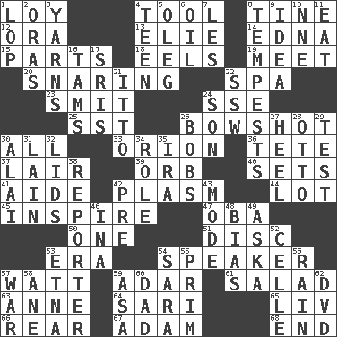 ACROSS 1. Myrna of the movies 4. Instrument 8. Prong on a fork 12. Mouth or opening 13. Writer Wiesel 14. Pulitzer Prize-winning author Ferber 15. Components 18. Snakelike fish 19. Confront 20. Catching in a trap 22. Health resort 23. Stricken, poetically 24. Compass dir. 25. Fast jet (abbr.) 26. The distance a bow sends an arrow 30. 100% 33. Greek mythologigal hunter 36. False hair 37. Den 39. Globe 40. Puts into a specified state 41. Assistant 42. Suffix with ecto or cyto 44. Car dealer's back yard 45. Stimulate to action 47. Chief or king in Benin or Nigeria 50. Single 51. Plate 53. Epoch 54. Orator 57. Electrical Unit 59. The sixth month of the Jewish calendar 61. Vegetable dish 63. Queen of England 1702-14 64. Indian skirt 65. 54 in ancient Rome 66. Stern 67. First man 68. Conclusion DOWN 1. Chop off 2. Mouths or openings 3. Entertaining tales 4. Adolescent 5. Cassini of fashion 6. Petroleum 7. French article 8. Storms 9. The main thing one is thinking about 10. Compass dir. 11. Erode 16. Scottish caps 17. Indian titles of respect 21. "Tell ____ the Marines!" 22. Compass dir. 24. Male offspring 26. Moves up and down 27. Person who is morally reprehensible 28. Von Bismarck 29. Trial 30. Jai _ 31. (Had) reclined 32. Hats (slang) 34. Hero or heavy, e.g. 35. Retirement account (abbr.) 38. News announcer 42. Before (prefix) 43. Method 46. _ tizzy (2 wds.) 48. Prejudice 49. "____ silly question..." 52. Cell (Danish) 53. Inactive volcano in Sicily 54. "Two Mules for Sister ____" 55. Demure 56. Water falling in drops from the sky 57. Armed conflict 58. A saturated hydrocarbon 59. White ___ sheet 60. June honoree 62. Movie disc