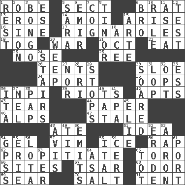 ACROSS 1. Loose flowing garment 5. Religious group 9. Naughty child 13. Greek god of love 14. Mine, in Marseilles 15. Get up 16. Trig term 17. Complicated, petty procedures 19. Coat; cloak 20. Armed conflict 21. Sep. follower 22. Consume 23. Sense of smell 25. To separate or throw off 26. Portable shelters 30. A type of plum 34. To the left, to Queeg 35. I made a mistake 36. Body of Kaffir warriors 39. Debaucheries 42. Flats, for short 43. Rend 44. Some stationery 46. High mountains 47. Having lost freshness 48. Had dinner 51. The main thing one is thinking about 54. Set 57. Zeal 58. Frozen water 60. Reproach for some lapse or misdeed 62. Conciliate 65. "Corrida" creature 66. Locates 67. Russian ruler of old 68. Aroma 69. Wither 70. Table seasoning 71. Portable shelter DOWN 1. Repose 2. Constellation of myth 3. Beat drum 4. Compass dir. 5. "Two Mules for Sister ____" 6. Arab leader 7. Gear tooth 8. The easternmost of the Lesser Sundas 9. Sis' sibling 10. Cause heat under the collar 11. At sea 12. Trial 15. Johnson of "Laugh-In" 18. Adept person 20. Shed a tear 24. Flight of steps 27. And not 28. Three (prefix) 29. Closes up, plugs up 30. Flew 31. Trim (branches) 32. Choose 33. Curvy letter 36. Call ___ day 37. Cartoonist voice _ Blanc 38. Infant food 40. Make lace 41. Health resort 45. Writer Wiesel 48. Advice 49. Teat (slang) 50. Gives off 52. Wear away 53. Composer Copland 54. Global Positioning Systems (abbr.) 55. One of the Great Lakes 56. Globular water bottle used in Asia 58. Slanted text style (abbr.) 59. Sure thing 61. Sweet dark-red dessert wine 63. For each 64. White ___ sheet 65. Small child
