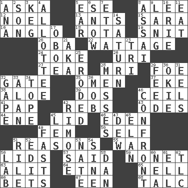 ACROSS 1. "____ silly question..." 5. Compass dir. 8. Toward shelter 12. Christmas carol 13. Pismires 15. "Two Mules for Sister ____" 16. White American of non-Hispanic descent 18. Roll call or roster of names 19. In a ____ (agitated or irritated) 20. Chief or king in Benin or Nigeria 22. Electrical Measurement 24. Puff or smoke 26. RI univ. 27. Rend 28. Medical imaging device (abbr.) 29. Enemy 32. Yard entry 35. Sign of something about to happen 37. Supplement with great effort 38. Medicinal plant 39. Two (Sp.) 40. To provide with a ceiling 41. Infant food 42. Confederate soldiers (slang) 43. Lyric poems 44. Compass dir. 45. Hat (slang) 46. Locale of original sin 49. Opposite of masc. 50. Automatically 51. Thinks logically 55. Armed conflict 56. Hats (slang) 57. Expressed in words 59. Music written for nine 63. Set down 64. Inactive volcano in Sicily 65. 1994 drama film starring Jodie Foster 66. Wagers 67. Car or cant ending 68. Baby powder DOWN 1. Santa ___, CA 2. Male child 3. Barrel 4. One to whom something is allotted 5. Ewer handle 6. Frozen precipitation 7. Singer James 8. Slender Brazilian palm 9. Long (Scottish) 10. 4th largest of the Great Lakes 11. Ingest 14. Titan orbits this 17. Mitch Miller's instrument 21. Alias (abbr.) 23. Three (prefix) 25. Eaten away 28. Makes clutter 29. Nourish 30. Migrant worker of the '30s 31. Snakelike fish 32. Stare wonderingly 33. Actor Alda or Thicke 34. Drink excessively 36. Crowd into 40. Meet 42. Full of chinks, cracks, or crevices 45. French article 47. Morning condensation 48. Liveliness 49. Goes without food and/or water 51. Cause heat under the collar 52. Prepare for publication 53. Nathan's nickname 54. Trig term 56. Experiment locale 58. One of the 12 tribes of Israel 60. Teachers' org. 61. Pipe bend 62. Affectionate concern, for short
