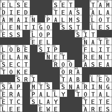 ACROSS 1. Otherwise 5. Arrange properly for use 8. Scottish cap 11. Passed on 12. Afternoon social gatherings 14. In the manner of 15. At full speed 17. Insides of hands 18. Car dealer's back yard 19. Small, flat, pigmented spot on the skin 21. Fast jet (abbr.) 22. French article 23. Curvy letter 24. Chop off 25. Be seated 27. Snakelike fish 28. Nathan's nickname 31. Ear part 35. Small drink 37. Sudden quick movement 38. Style 39. Remaining after all deductions 41. Monthly bill 42. Religious group 43. Friend of Pooh 45. Toward the sea 46. Puff or smoke 47. Mouth or opening 49. _ Lanka 51. Bar bill 52. Lion 55. Plant excrement 57. Mountains (abbr.) 60. Catching in a trap 62. Period 63. Friendly 65. "_____ Recall" 66. And so on (abbr.) 67. Kill 68. False hair 69. Area sheltered from the wind 70. She-sheep 71. Ancient Greek god of war DOWN 1. Peak District village in England 2. Citrus fruits 3. Actors Connery and Penn 4. Prepare for publication 5. R.R. building 6. Snakelike fish 7. Scottish caps 8. Baron Munchausen's specialties 9. _ vera 10. Floor protectors 13. Fast planes 16. Mediterranean tributary 17. Cotton for raincoats, e.g. 20. Leaves 26. Kind of red light 29. Prong on a fork 30. Singer James 31. For fear that 32. Butter sub 33. Keyboard key 34. Keyboard key 36. For each 40. A girl or young woman (variant) 44. Northwest Algerian city 48. Blind as ____ 50. Naughty children 52. 61 cubic inches 53. Maternal 54. Stares 55. Stitch closed the eyes of (a falcon) 56. Johnson of "Laugh-In" 58. Lie 59. Cole _ (cabbage dish) 61. Round or rotation of duties 64. Potassium hydroxide