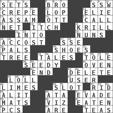 ACROSS 1. Puts into a specified state 5. Sis' sibling 8. Compass dir. 11. Streamer paper 13. Chop off 14. Writer Wiesel 15. Indian state 16. Baseball player Mel 17. Give a ring to 18. Remaining after all deductions 19. Hankering 21. Shrimp-like planktonic crustaceans 22. To the inside or interior of 24. Religious women 25. Buttonhole 27. Compass dir. 29. Friends 30. Imelda's hoard 32. Family _ (genealogy) 33. Falsehoods 35. Lacquered or enameled metalware 39. Morally degraded 41. Baking chamber 42. Conclusion 43. Keyboard key 45. Hang loosely or laxly 48. One who uses or employs something 49. Citrus fruits 50. Narrow, elongated depression 52. To free from 55. Came down and settled, as after flight 56. _ moment's notice (2 wds.) 57. Dodge 59. Floor coverings 60. To wit 61. Ingested 62. Personal Computers (abbr.) 63. "We ___ not amused" (Victoria) 64. Beverages made from leaves DOWN 1. Examine hastily 2. Celtic language 3. One of the two male reproductive glands 4. Health resort 5. Coalition 6. Writer of Portnoy's Complaint (1969) 7. Elect 8. Killed 9. Beverly of Met fame 10. Not ill 12. Sends forth 14. Shade of tan 20. Small child 21. Leg joint 23. Olfactory organs 25. Fitting 26. Auto 27. A female animal or person 28. Mayday 30. Cunning 31. Fur scarf 33. Nine, plus one 34. Say or write further 36. Make much ado about nothing 37. Allow 38. Compass dir. 40. Snakelike fish 43. Superhero pair 44. First name in cosmetics 45. Pale purple color 46. Leaves out 47. Allows 49. Desk light 50. Move through with a circular motion 51. Goldbrick 53. The content of cognition 54. Cub Scout units 56. Actress Gardner 58. Large container