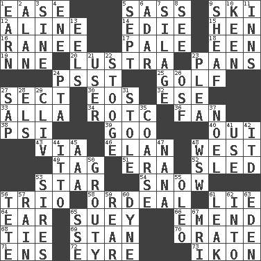 ACROSS 1. Comfort 5. Backtalk 9. What Jean-Claude Killy likes to do 12. Place in a line 14. Singer Brickell 15. Layer 16. The wife of a rajah (variant) 17. Light colored 18. Car or cant ending 19. Compass dir. 20. A period of five years 23. Zero-star reviews 24. Inconspicuous attention getter 25. _ course 27. Religious group 30. Greek goddess of the dawn 32. Compass dir. 33. Silent film actress Nazimova 34. College mil. group 36. Avid follower 38. Air pressure measure (abbr.) 39. Thick or sticky substance 40. Fr. "Yes" 43. By way of 46. Flair 48. 270 degrees 49. Label 51. Period 52. Downhill vehicle 53. Play the lead 54. Frozen precipitation 56. Musical group of three 58. Severe or trying experience 61. Untruth 64. Hearing organ 65. Chop _ 66. Make improvements or corrections to 68. Make a knot 69. Comedian Laurel of Laurel & Hardy 70. Declaim 71. Followers of ems 72. Jane of fiction 73. Visual representation of an object DOWN 1. Merit 2. ____ Jay Lerner 3. Trig term 4. Compass dir. 5. Back-to-school mo. 6. The sixth month of the Jewish calendar 7. Fodder prepared in a silo 8. Observe 9. Bundle of cut stalks of grain 10. Peachy ____! 11. Restaurants 13. Snakelike fish 21. One who makes use of a thing 22. Moe Howard, for one 23. Entreaty 24. Parent Teacher Association (abbr.) 26. Order of Saint Francis (abbr.) 27. Plant excrement 28. Raised railways 29. 154 in Roman numerals 31. Fur scarf 35. Rough 37. Christmas carol 41. Purpose 42. It would 44. "Tell ____ the Marines!" 45. American Automobile Association (abbr.) 47. Nanny 48. Compass dir. 50. Sulky 53. Male parents of animals 55. Butter sub 56. False hair 57. Water falling in drops from the sky 59. Stern 60. Centimeter-gram-second unit of force 61. Path through which fluid escapes 62. To the inside or interior of 63. Locale of original sin 65. Compass dir. 67. Medical imaging device (abbr.)
