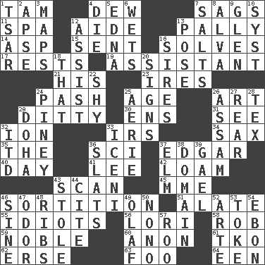 ACROSS 1. Scottish cap 4. Morning condensation 7. Sinks 11. Health resort 12. Assistant 13. Friendly 14. Cleo's killer 15. Posted 16. Finds the solution 17. Musical pauses 19. Helper 21. Part of HMS, perhaps 23. Angers 24. Romantic infatuation 25. Mature 26. Nonscientific branch of learning 29. Short, simple song 30. Followers of ems 31. Perceive with the eye 32. Electrically charged atom 33. Big collection agency 34. Saxophone 35. Definite Article 36. _-fi 37. _ Allan Poe 40. 24 hours 41. Area sheltered from the wind 42. Rich soil 43. Skim 45. Madame (abbr.) 46. Decision 51. Having winglike extensions 55. Foolish or stupid persons 56. Australian parrot (variant) 58. Director Reiner 59. Having high moral qualities 60. At once, immediately (arch.) 61. Ring climax 62. Celtic language 63. Egg _ yung 64. Car or cant ending DOWN 1. Russian ruler of old 2. Domed church section 3. Atlas contents 4. Expire 5. Pulitzer Prize-winning author Ferber 6. Moistens 7. Table seasonings 8. Inventor's middle name 9. Small, secluded valley 10. System (abbr.) 12. Aid 13. Introduce or present, as a question 16. Founders of families 18. Not this but _ 20. Attaches a signature 22. Like a shrinking violet 24. Abounding in pines 25. Nest on high 26. Indian state 27. Stern 28. John Ritter's dad 29. Capital of the state of Qatar 32. It would 33. Ancient Celtic tribe of eastern Britain 36. Narrow boards 37. Shade tree 38. Realm 39. Highlander 43. Took without asking 44. Quote 46. Trig term 47. Scent 48. Teases 49. Norwegian king 50. Words to Nanette 52. Johnson of "Laugh-In" 53. Casino tip 54. Inky black, to poets 57. Friend of Pooh