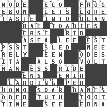 ACROSS 1. Connecting point 5. Environmental prefix 8. Toadlike animal 12. Inky black, to poets 13. Allows 15. Old wives' tales, e.g. 16. Clothes sense 18. To the inside or interior of 19. Uhlan (variant) 20. Actress Charlotte 22. Sycophants 24. Celtic language 26. To free from 27. At sea 28. Area sheltered from the wind 29. Eastern Standard Time (abbr.) 32. Inconspicuous attention getter 35. Downhill vehicle 37. Born 38. Trust 39. Car or cant ending 40. Lyric poems 41. Call ___ day 42. In addition 43. Electrical Unit 44. Informal term for the mouth 45. Double-curved letter 46. Travel on or in a vehicle 49. Followers of ems 50. Independent ruler or chieftain 51. Preparing or cooking with lard 55. For each 56. Same (prefix) 57. Fly high 59. Natives or inhabitants of Denmark 63. Wrote a lyric poem 64. Ballerina skirt 65. A blast of a horn 66. Prong on a fork 67. Observe 68. Pulitzer Prize-winning author Ferber DOWN 1. Fish or hair follower 2. Chief or king in Benin or Nigeria 3. Two (Sp.) 4. Plea 5. Biblical high priest 6. Penny 7. "Beetle Bailey" pooch 8. Watery 9. Hero or heavy, e.g. 10. Mouths or openings 11. Commissioned military rank (abbr.) 14. Flew 17. Hearing organs 21. Compass dir. 23. Pass on 25. Artist's stands 28. Poe poem 29. Inside; within (prefix) 30. Stitch closed the eyes of (a falcon) 31. Trial 32. Demure 33. Stalk of a moss capsule 34. Cole _ (cabbage dish) 36. French article 40. Make much ado about nothing 42. Aid 45. Conclude 47. Naughty child 48. Passed on 49. Eat (away) 51. Farming town in central California 52. So be it 53. Horse sense 54. Yard entry 56. Being at a high temperature 58. Sorrow 60. Lower and raise head in agreement 61. A really long time 62. R.R. building