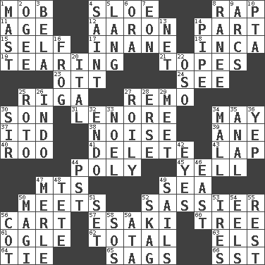 ACROSS 1. Crowd into 4. _ gin 8. Strike 11. Grow older 12. Composer Copland 14. Piece 15. Oneself 17. Empty; void 18. South American Indian 19. Lacerating 21. Drinks excessively 23. Baseball player Mel 24. Perceive with the eye 25. Port city in Latvia 27. San ____ (Riviera town) 30. Male child 31. Poe poem 34. Fifth month 37. It would 38. Annoying sound 39. One (Scot) 40. Friend of Pooh 41. Erase 43. Pet locale 44. Much (prefix) 45. Shout 47. Mountains (abbr.) 49. Ocean 50. Confronts 52. More lively and spirited 56. Heavy open wagon 57. 1973 Nobel Price Winner (Physics) Leo 60. Relationship diagram 61. Stare at amorously 62. "_____ Recall" 63. Raised railways 64. Neckwear 65. Sinks 66. Fast jet (abbr.) DOWN 1. Vertical spar for supporting sails 2. Double curve, resembling the letter S 3. Actor Lugosi 4. Virtuous person 5. Long (Scottish) 6. Mouth or opening 7. Period of immesurable duration 8. Indian princess (variant) 9. Curves 10. Parent Teacher Association (abbr.) 13. Fish or hair follower 14. Corncob 16. Tree-dwelling hopper 20. Slanted text style (abbr.) 22. Bear (Spanish) 25. Printing process, for short 26. _ china 27. Agitated, as a liquid 28. Celtic language 29. Confront 30. Title for a knight 32. Inside; within (prefix) 33. Christmas carol 34. Shopping center 35. Of or related to the anus 36. Slangy assent 42. Sight organs 44. Pacific Standard Time (abbr.) 46. Compass direction 47. Haggard of country music 48. False hair 49. Travels by water 50. Wise men 51. Arrange properly for use 52. Heroin 53. Angers 54. Snakelike fish 55. State of inaction 56. Small bed 58. Distress signal 59. "One Day ___ Time"