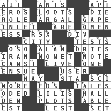 ACROSS 1. Small island 4. Pismires 8. Fitting 11. Greek god of love 13. Plunders 15. Expire 16. Hero or heavy, e.g. 17. Therefore, facetiously 18. Open wide 19. An arm off of a larger body of water 21. "We ___ not amused" (Victoria) 22. Sign of things to come 23. Curvy letter 24. Acura sports coupe 27. HTML Container Element 29. Municipality 30. Trials 34. Bear (Spanish) 36. Actor Alda or Thicke 39. Frees from moisture 40. SW Asia republic 41. Music written for nine 43. Make mention of 44. 2nd pers. sing. pres. of can (arch.) 46. Not recorded 47. Single 48. Take place subsequently 49. One who uses or employs something 51. Can I? 53. R.R. building 54. _-fi 57. Greater amount 60. Begley and Asner 63. Falsehoods 65. Wrote a lyric poem 66. Ms. Damita and namesakes 69. Promenade 70. Lair 71. Ground plans 72. Competent 73. Eastern Standard Time (abbr.) 74. For fear that 75. Arrange properly for use DOWN 1. Nest on high 2. Removes the wrinkles 3. For Whom the Bell _____ 4. Wing 5. Not either 6. Ancient Roman robe 7. Play the lead 8. First man 9. Corncob 10. Adolescent 12. Perceive with the eye 14. Downhill vehicle 18. State head 20. Three (prefix) 25. Comedian Laurel of Laurel & Hardy 26. Xylene (variant) 28. It would 29. Eaten 31. The Jewish people; Israel 32. Wig 33. Compass dir. 34. Northwest Algerian city 35. Without 37. Black tropical American cuckoo 38. Congenital growth or mark on the skin 40. Frozen water 42. Trial 45. Beverage made from leaves 50. Erode 52. Sharp bark 54. Broad, flat, thick pieces 55. Cell (Danish) 56. Small island 57. Method 58. Lyric poems 59. Monthly bill 61. Deli pickle 62. _ gin 64. Nursemaid (var.) 67. ___ a Wonderful Life 68. Fast jet (abbr.)