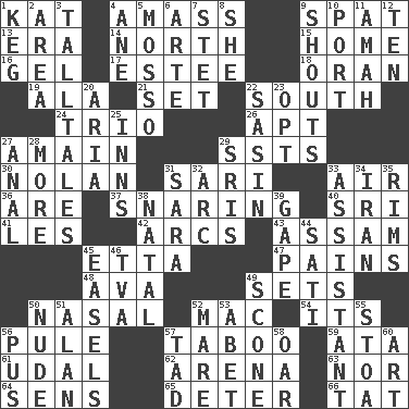 ACROSS 1. Krazy ___ of comics 4. Collect or gather 9. Argument over a trivial matter 13. Period 14. _ pole 15. Residence 16. Set 17. First name in cosmetics 18. NW Algerian seaport 19. In the manner of 21. Arrange properly for use 22. Compass direction 24. Musical group of three 26. Fitting 27. At full speed 29. Fast planes 30. Pitcher Ryan 31. Indian skirt 33. Atmosphere 36. "We ___ not amused" (Victoria) 37. Catching in a trap 40. Indian title of respect (Mr.) 41. French article 42. Curves 43. Indian state 45. Singer James 47. Aches 48. Actress Gardner 49. Puts into a specified state 50. Rhinal 52. Big _ 54. It is 56. Whine 57. Off limits 59. "One Day ___ Time" 61. Freehold land 62. Sports stadium 63. And not 64. Elected reps. 65. Prevent from occurring 66. Make lace DOWN 1. Barrel 2. Length times width 3. Baron Munchausen's specialties 4. A saturated hydrocarbon 5. With motion or animation 6. Johnson of "Laugh-In" 7. Proofreading order 8. A female animal or person 9. Yells 10. Sweet dark-red dessert wine 11. Nursemaid 12. "___ Little Indians" 20. Roberta Peters solo 22. Indian antelope 23. Elect 25. Lodging establishments 27. Of or related to the anus 28. Greater amount 29. Indian titles of respect 31. "Two Mules for Sister ____" 32. Curve 33. Aide 34. SW Asia republic 35. Basketball hoops 38. Relating to or accompanying birth 39. Open wide 44. Suttee (variant) 45. Artist's stands 46. Federal power corp. 49. Biscuitlike quick bread 50. Unadorned 51. Actor Alda or Thicke 52. Female horse 53. Collude with 55. Portico 56. Fluid product of inflammation 57. Small boy 58. Rowing implement 60. Tate display