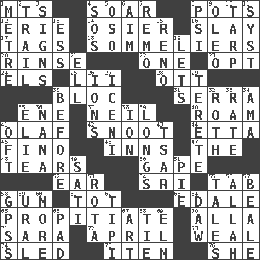 ACROSS 1. Mountains (abbr.) 4. Fly high 8. Cooking vessels 12. One of the Great Lakes 14. Flexible twig of a willow tree 16. Kill 17. Labels 18. Wine waiters 20. Wash lightly 22. Single 23. Choose 24. Raised railways 25. Cards in a Roman deck? 28. Baseball player Mel 30. Coalition 31. Father Junipero _ 35. Compass dir. 37. Famous astronaut Armstrong 40. Wander 41. Norwegian king 42. Snout, nose 44. Singer James 45. Fine (Spanish) 46. Taverns 47. Definite Article 48. Rends 50. Stare wonderingly 52. Ewer handle 54. _ Lanka 55. Bar bill 58. Chewing product 61. Small child 63. Peak District village in England 65. Appease 70. Silent film actress Nazimova 71. "Two Mules for Sister ____" 72. Showery time 73. Welt 74. Downhill vehicle 75. A distinct part 76. A female animal or person DOWN 1. Distance measurement (Brit.) 2. Drop behind 3. Attaches a signature 4. Mayday 5. Bear (Spanish) 6. Direct toward a target or goal 7. San ____ (Riviera town) 8. 23rd letter of the Greek alphabet 9. Butter sub 10. Canvas cover 11. System (abbr.) 13. Double-curved letter 15. Western Nevada city 19. Allows 21. Pipe bend 26. Charged particles 27. Ancient Celtic tribe of eastern Britain 29. Cigar-shaped 30. Prior to 32. Writer of Portnoy's Complaint (1969) 33. Assign a rank or rating to 34. Wet nurse (var.) 35. Writer Wiesel 36. Grandmother 38. Electrically charged atom 39. Yearns 41. Often (poetically) 43. Russian ruler of old 49. Suttee (variant) 51. Sliced dessert 53. Round or rotation of duties 55. Falsehoods 56. Assad's deity 57. Calif. Air Force Base 58. Global Positioning Systems (abbr.) 59. Mountain range 60. Greater amount 62. Native american tent (variation) 64. Simpleton 66. Groovy apt. 67. Tate display 68. Make a knot 69. Shade tree